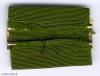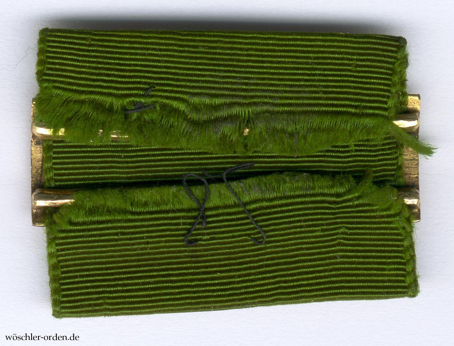 Das Barett etwa 15,3 mm x 45,5 mm, Bronze feuervergoldet, rückseitig zwei Bügel zum Durchziehen des einfarbig grünen Bandes. Die Miniaturen jeweils in Silber, die Medaille außerdem teilweise geschwärzt.