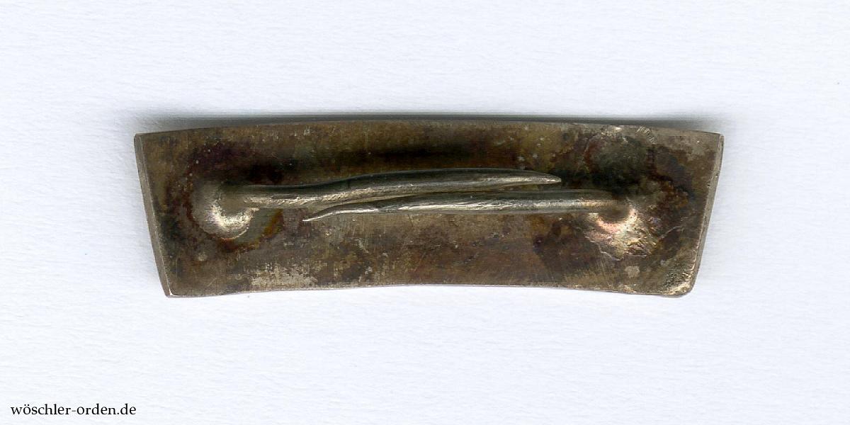 Silber, leicht gewölbt, massiv gefertigt, die Schrift herausgearbeitet. Rückseitig zwei angelötete spitze Splinte.