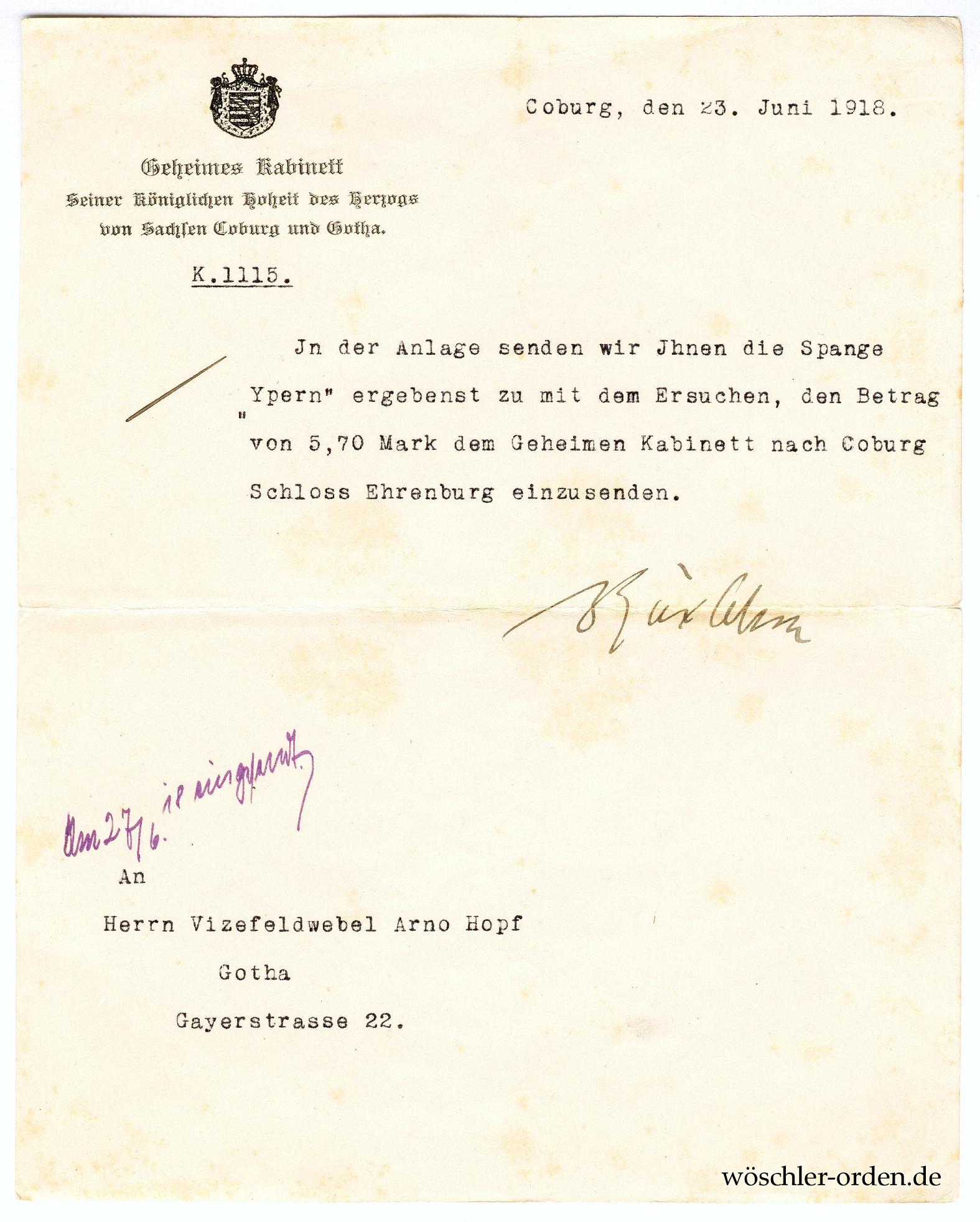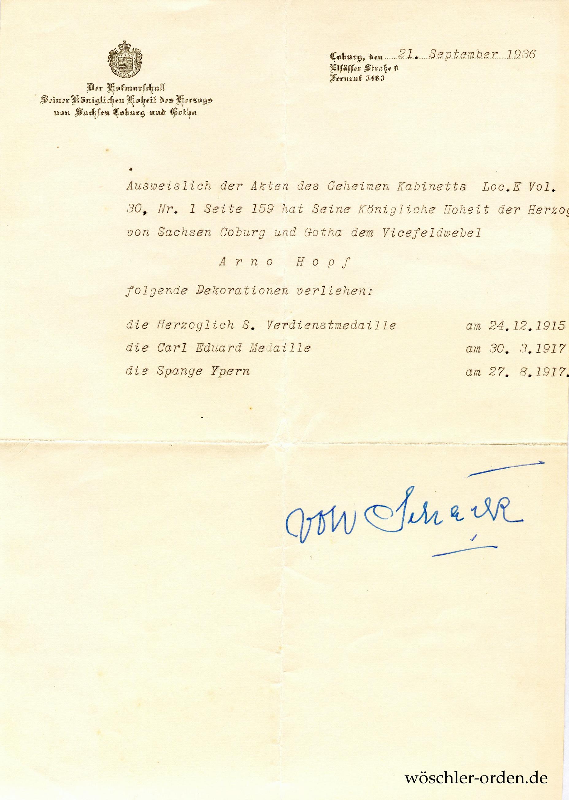 Dazu das Übersendungsschreiben vom 23. Juni 1918 an den Vizefeldwebel Arno Hopf in Gotha sowie eine Aufstellung der ihm verliehenen Sachsen-Coburg und Gotha’schen Auszeichnungen vom 21. September 1936.