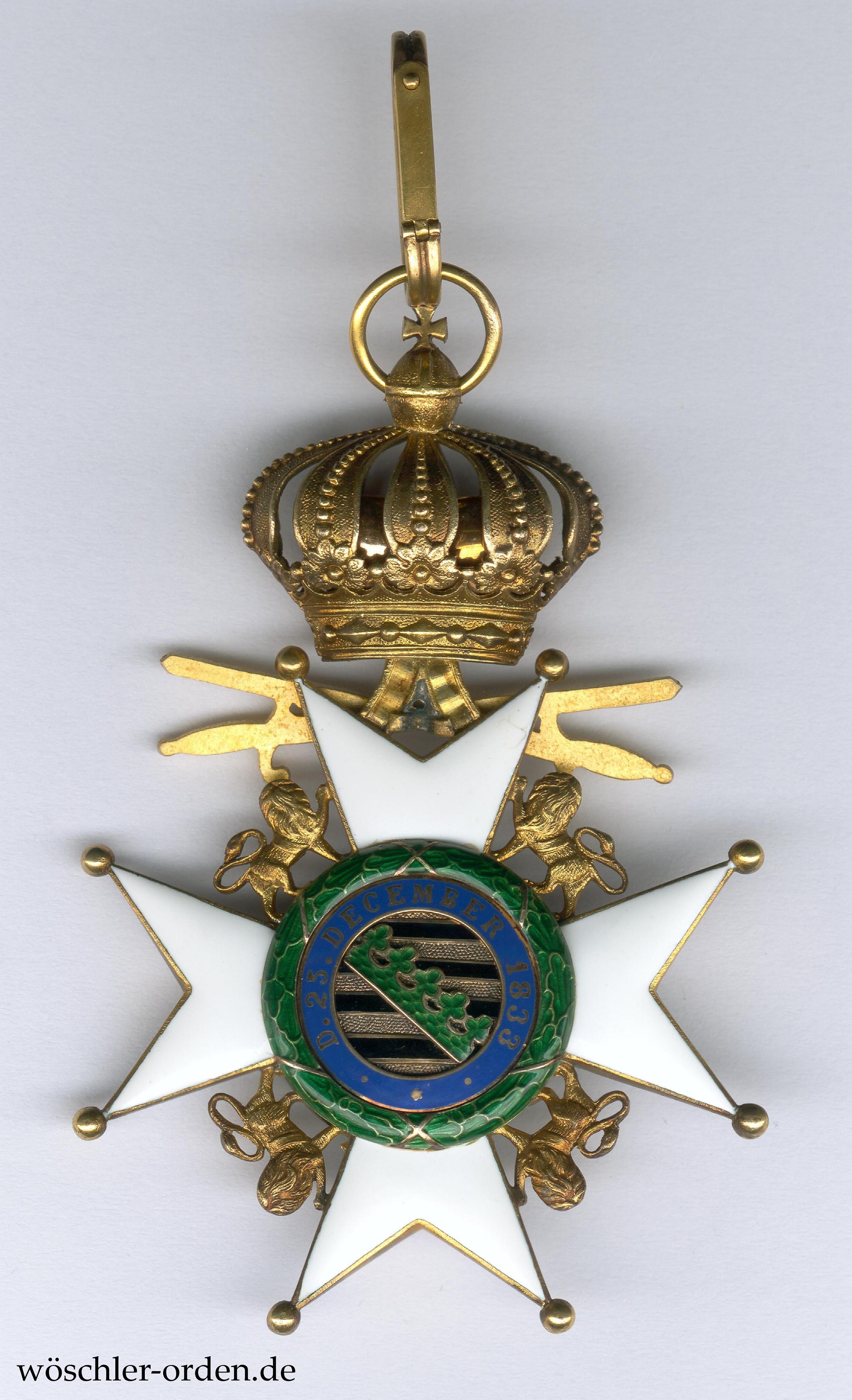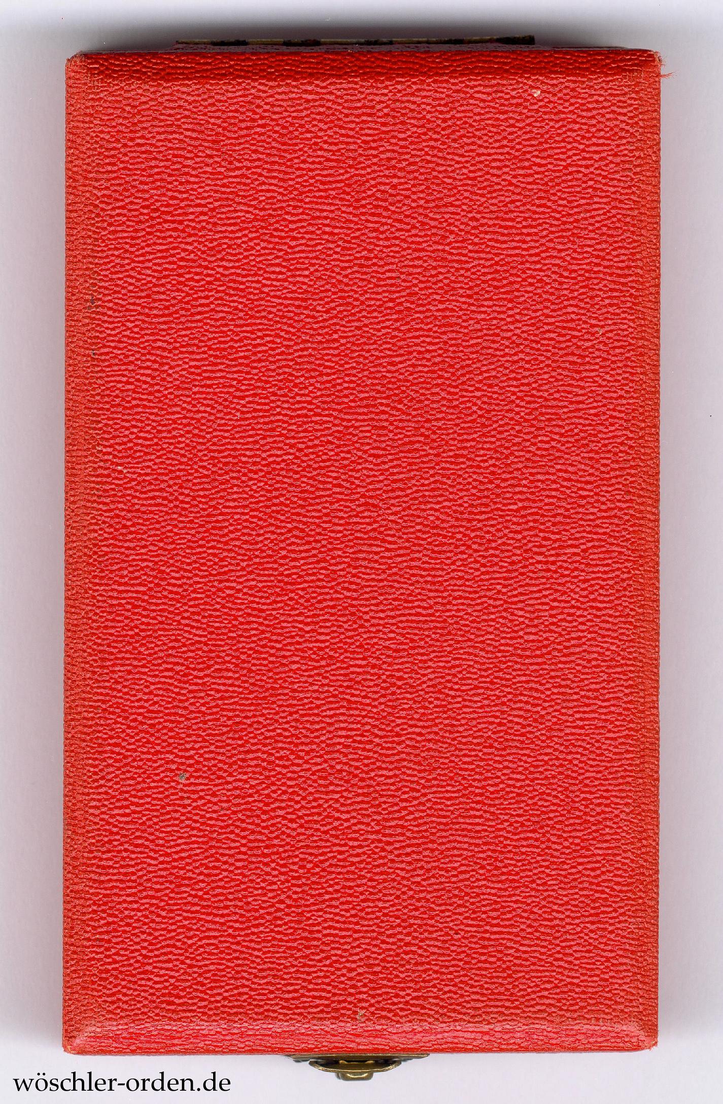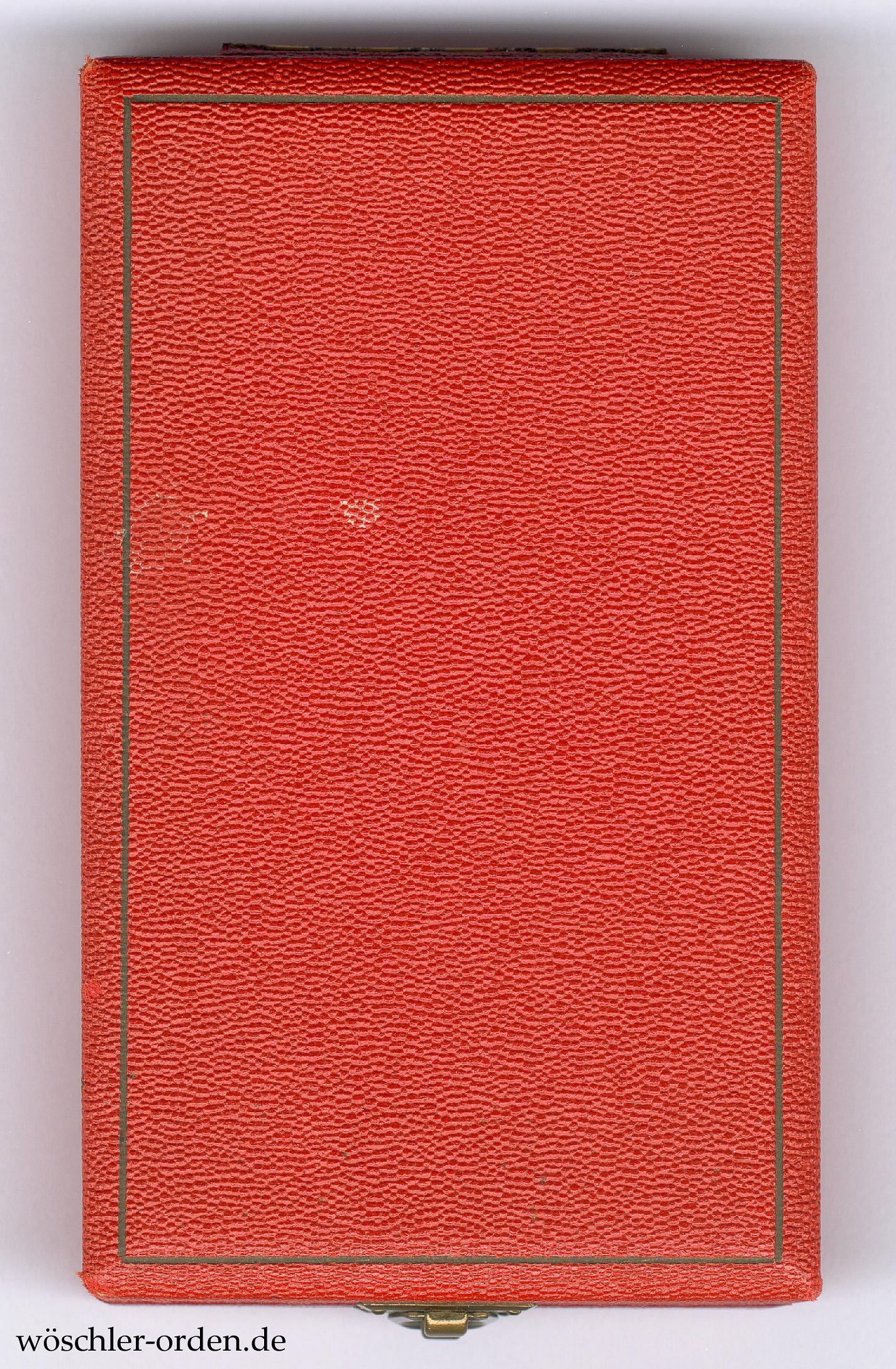Dazu das schmucklos-rote Verleihungsetui mit goldener Zierlinie auf dem Deckel, innen mit grüner Samteinlage mit Aussparung für das Ordenskreuz, der Deckel in weißer Seide mit schwarzem Herstellersignet „Paul Meybauer / Hoflieferant / Berlin SW 68“ unter dem Wappen Herzog Carl Eduards von Sachsen-Coburg und -Gotha.