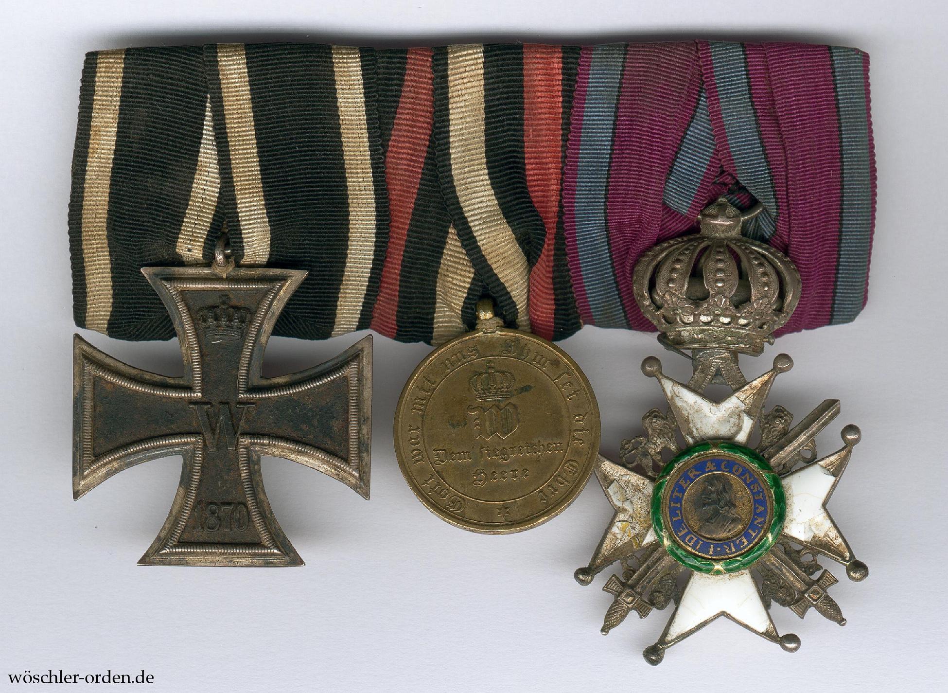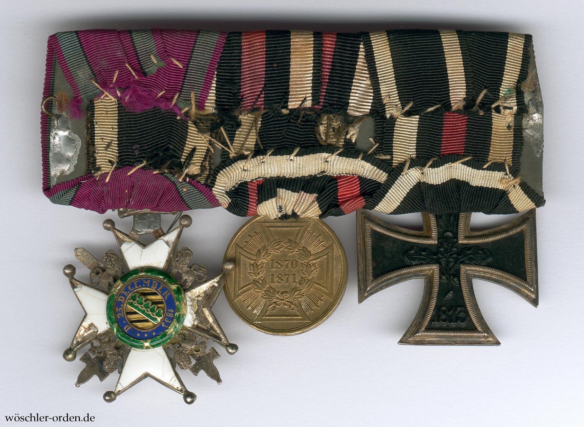 Wohl Herzogtum Sachsen-Coburg und -Gotha, 3er Ordensschnalle eines Offiziers und Teilnehmers des Deutsch-Französischen Krieges von 1870/71, mit folgenden Auszeichnungen: