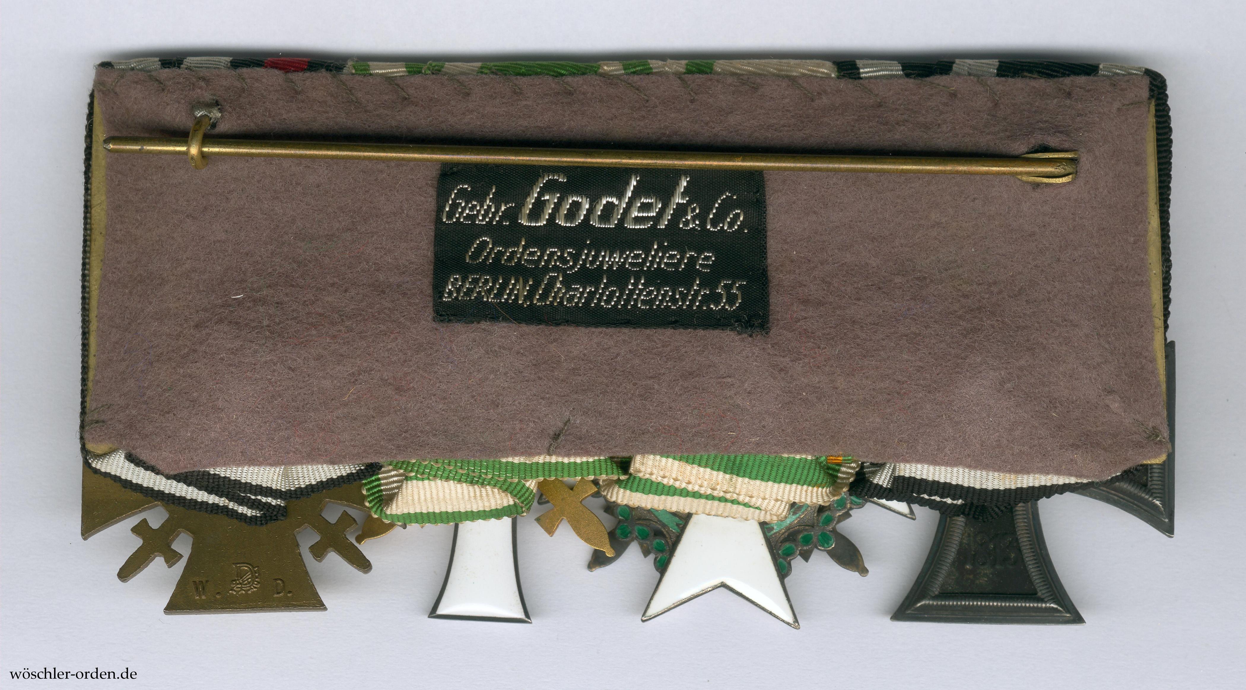 Das Eiserne Kreuz als späteres Zweitstück der Firma C. F. Zimmermann, Pforzheim, mit matt lackiertem Kern, Verdienstorden wie Albrechtsordens ohne ersichtliche Herstellerkennzeichnung, bei letzterem – eine Ausführung mit einseitig geprägten Schwertern – könnte es sich um ein Zweitstück handeln. Die Schnalle mit sauber konfektionierten Bogenbändern, rückseitig Tragenadel und graue Stoffabdeckung mit Etikett der Ordensjuweliere Gebr. Godet & Co., Berlin.