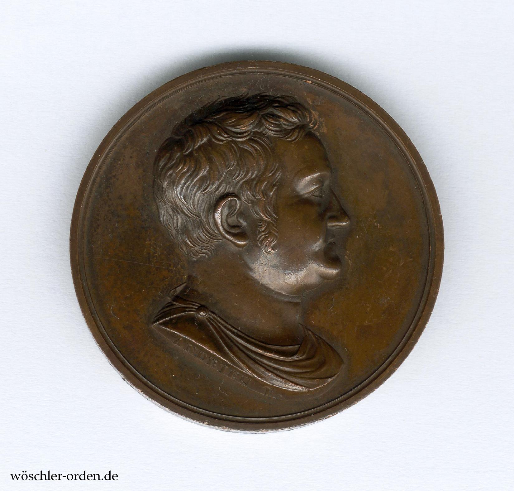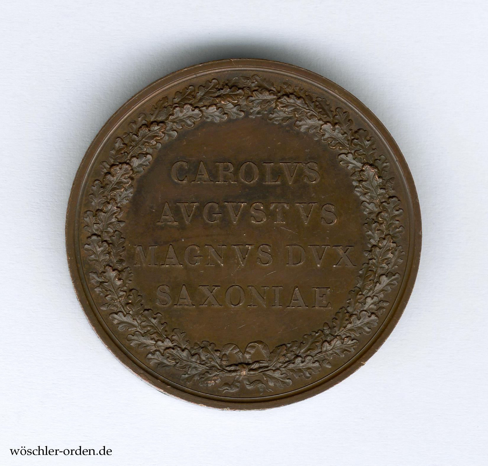 Ausgabe mit der Rückseiteninschrift „CAROLVS / AVGVSTVS / MAGNVS DVX / SAXONIAE“. Bronze geprägt, ungehenkelt. Vorderseitig das nach rechts gewendete Portrait des Stifters in antiker Gewandung, am Halsabschnitt Signatur „ANDRIEU F.“. Rückseitig besagte vierzeilige Inschrift in mit einer Doppelschleife gebundenem Eichenkranz.