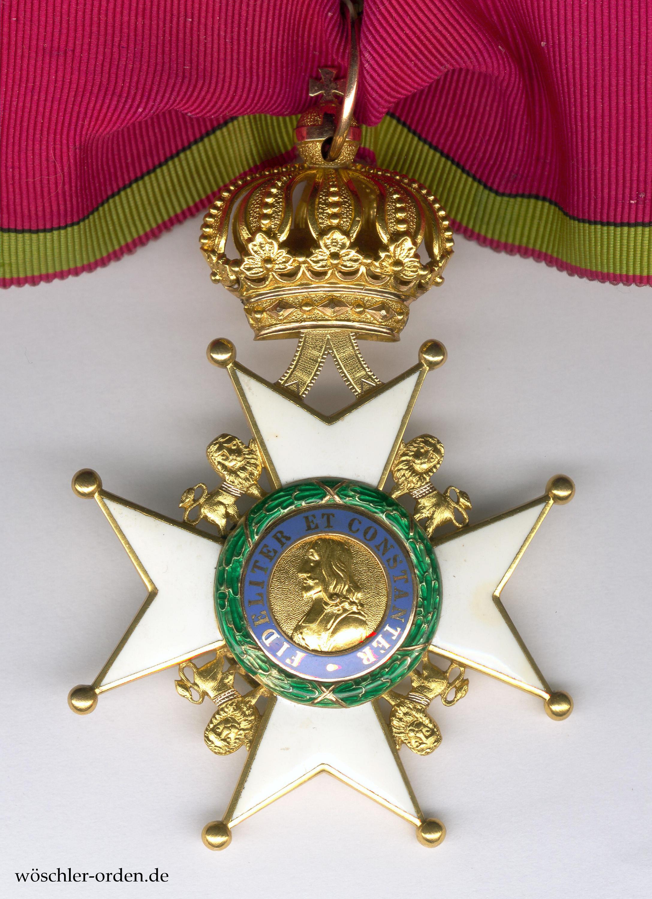 Exemplar des zweiten, angeblich ab 1864 verliehenen Modells, ohne aufgelegten Buchstaben auf dem oberen Kreuzarm, in einer Fertigung aus der Zeit um etwa 1900. Gold, mehrfarbig gearbeitet und emailliert, die Krone, Kronenbänder und Löwen feinst nachgearbeitet.
