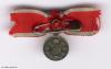 Miniatur, etwa 14 mm, Silber geprägt, an zwei starr angelöteten Ringchen an sauber konfektionierter, kleiner Damenschleife mit dem aufgelegten, emaillierten Abzeichen mit dem Genfer Kreuz. Rückseitig Sicherheitsnadel.