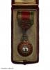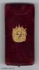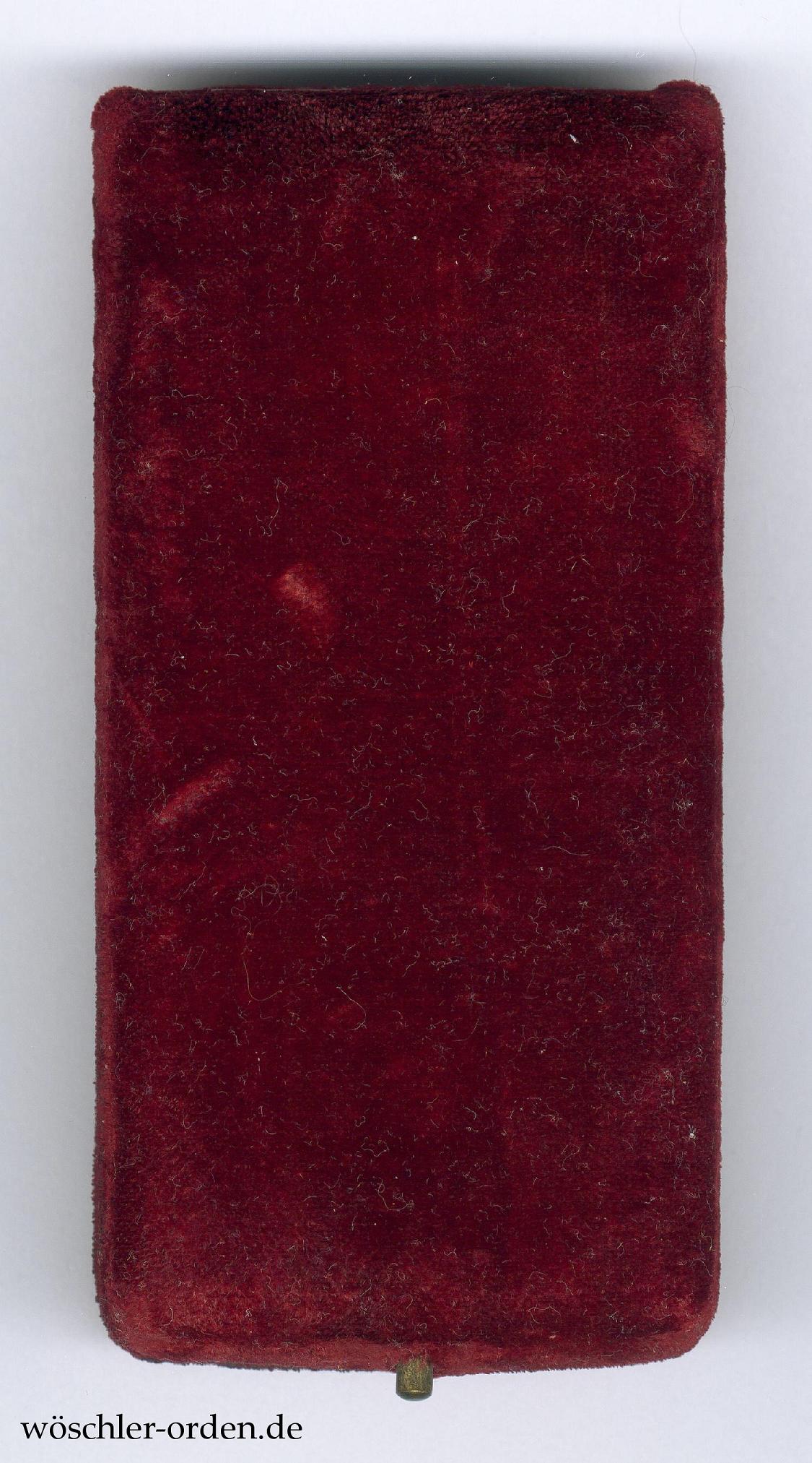 Dazu das weinrot-samtene Verleihungsetui mit goldenem Wappenaufdruck, innen hellblaue(?) Einlage mit Aussparung für die Ordensdekoration nebst Band, die seidene Innen-Verkleidung des Deckels mit goldgeprägter Herstellerangabe „TO THE LATE QUEEN / J. W. BENSON LTD / 25. OLD BOND ST / LONDON.“, die das Stück in die Zeit (wohl kurz) nach dem Tod Königin Viktorias 1901 datieren lässt.