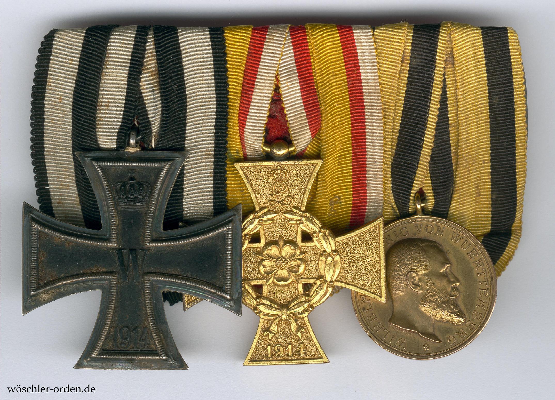 Die Auszeichnungen allesamt verliehene Originalstücke, die württembergische Medaille mit Feingehaltspunzierung „333“ in der Ringöse. Bogenförmig vernähte Bänder, rückseitig rote Stoffabdeckung und stabile, stählerne Tragenadel.