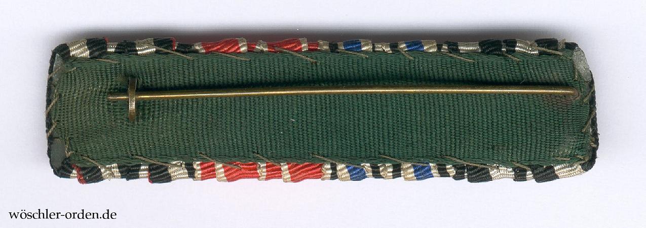 Gerafft vernähte Bänder, das bayerische mit versilberten(?), das des Ehrenkreuzes mit vergoldeten Schwertern. Rückseitig grüne Stoffabdeckung und Tragenadel.