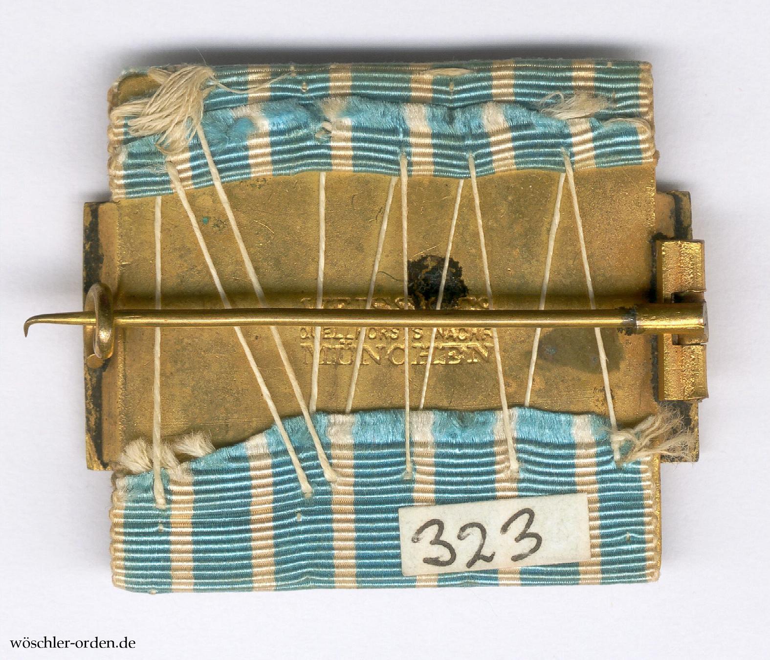 Bronze geprägt, durchbrochen gearbeitet und vergoldet, an mit Band bezogener Tragespange. Rückseitig dreizeilige Herstellerpunzierung „WEISS & Co. / QUELLHORSTS NACHF. / MÜNCHEN“ sowie horizontal angebrachtes Nadelsystem mit dünner Rundnadel.