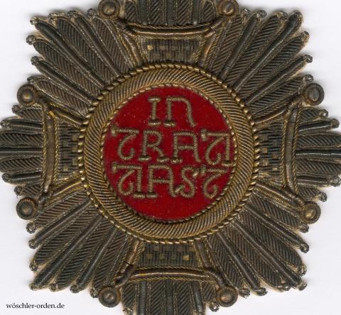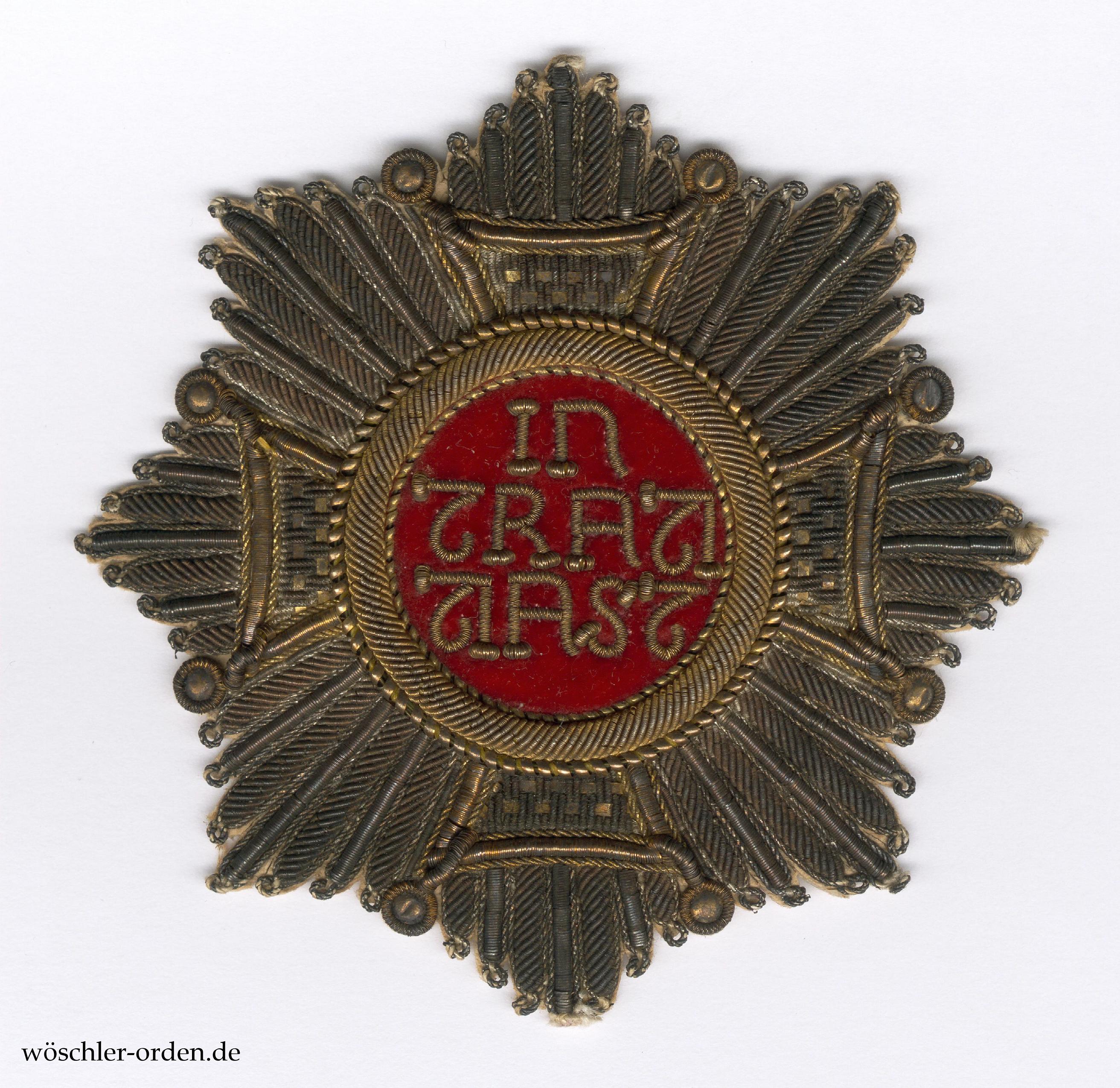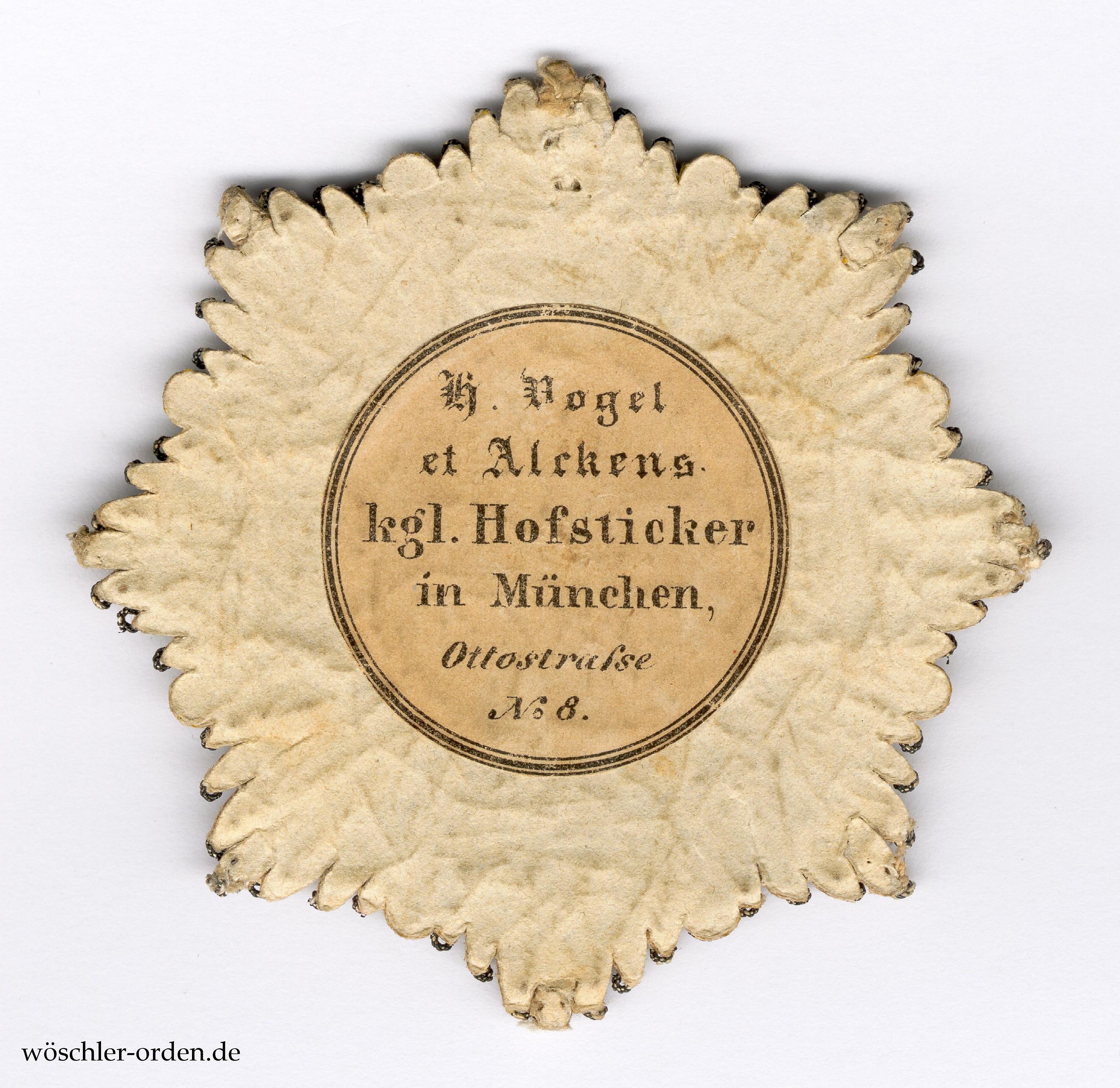 Bruststern der Ordensritter in gestickter Ausführung, wie er bis zum Ende des 19. Jahrhundert probemäßig üblich war, in mit einem Durchmesser von etwa 7,5 cm kleineren Abmessungen, möglicherweise für einen jugendlichen Prinzen. Silber- und Goldfadenstickerei, Hintergrund des Medaillons in rotem Samt. Rückseitig aufgeklebte Papierabdeckung mit dem gedrucktem Herstelleretikett von „H. Vogel / et Alckens / kgl. Hofsticker / in München, / Ottostrasse / No. 8.“, die Angaben in sechs Zeilen. Klenau bildet ein sehr ähnliches, jedoch größeres Exemplar derselben Fertigung ab und datiert dieses in das zweite Viertel des 19. Jahrhunderts.