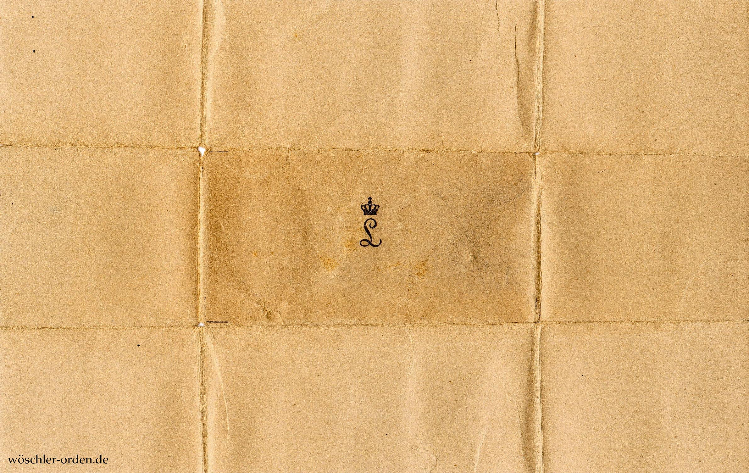 Dazu die Umhüllung aus cremefarbenem Papier, etwa 27 cm x 17 cm, mit aufgedrucktem bekörntem „L“. Beiliegend außerdem eine Miniatur-Bandschleife an Tragenadel.