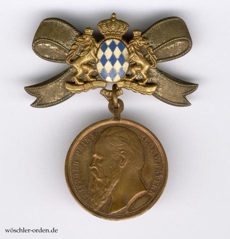 Buntmetall geprägt, Durchmesser etwa 28 mm , an parallel mitgeprägter, gelochter Öse. Vorderseitig das Portrait des Prinzregenten Luitpold, rückseitig Zweckinschrift. An aus Buntmetall hohlgeprägter Tragespange in Form einer Schleife mit dem vergoldeten und teilweise lackierten Staatswappen mit Krone und zwei Löwen als Schildhaltern. Auf der Rückseite broschiertes Nadelsystem mit Herstellerangabe der Firma Eduard Scherm, Nürnberg.