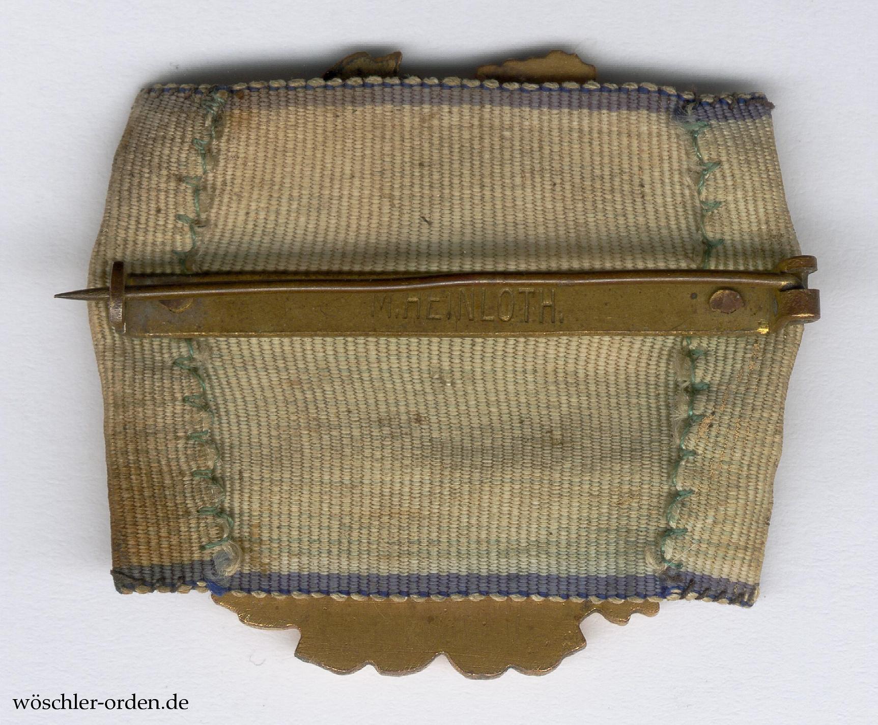 Buntmetall massiv geprägt und vergoldet, das grüne Band mit schmalen weiß-blauen waagrechten Randstreifen durch das Nadelsystem vernietet. Auf letzterem eingeschlagene Herstellermarkierung „M.HEINLOTH.“ des Hofjuweliers Mathias Heinloth, München, der zugleich auch Vorsitzender der Verleihungskommission (sic) war.