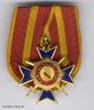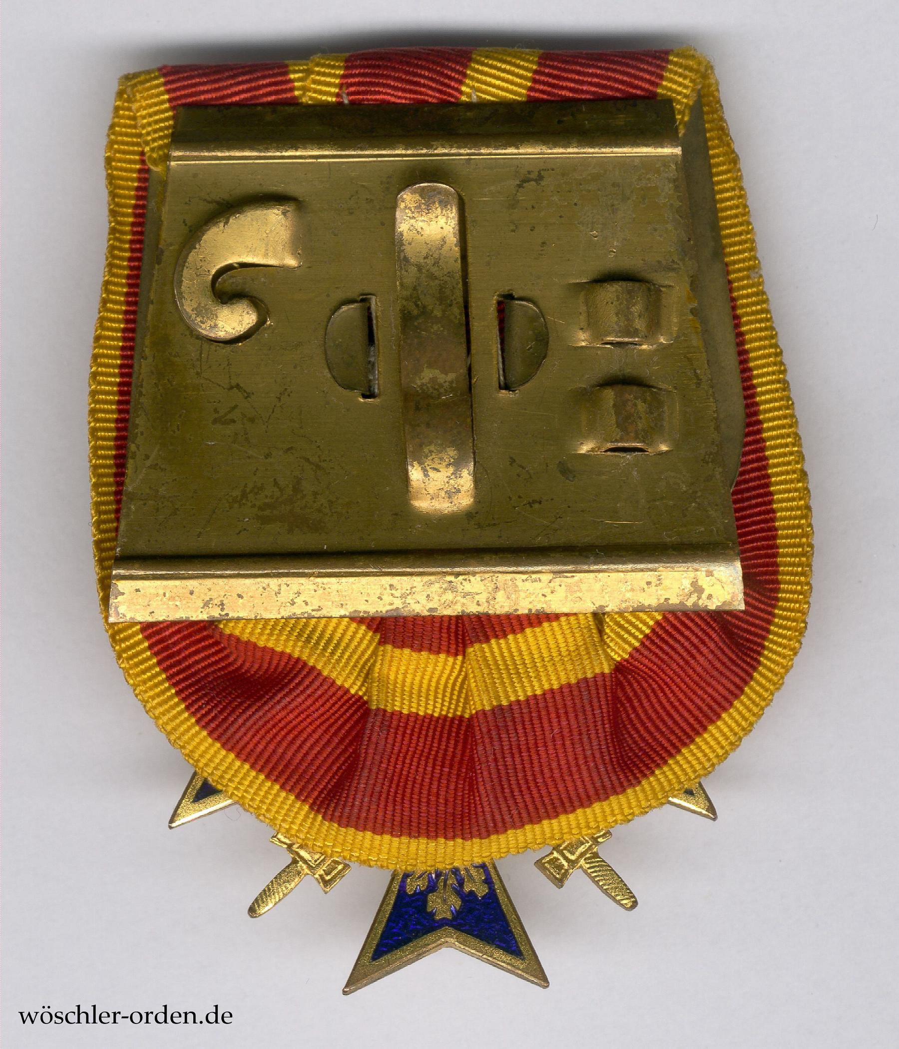 Buntmetall mehrteilig gefertigt, vergoldet und mehrfarbig emailliert, an mitgeprägter, gelochter Parallelöse, durch diese ein kleines Ringchen. An mit bogenförmigem Band konfektionierter Einzel-Ordensschnalle, diese rückseitig ohne eine Stoffabdeckung.