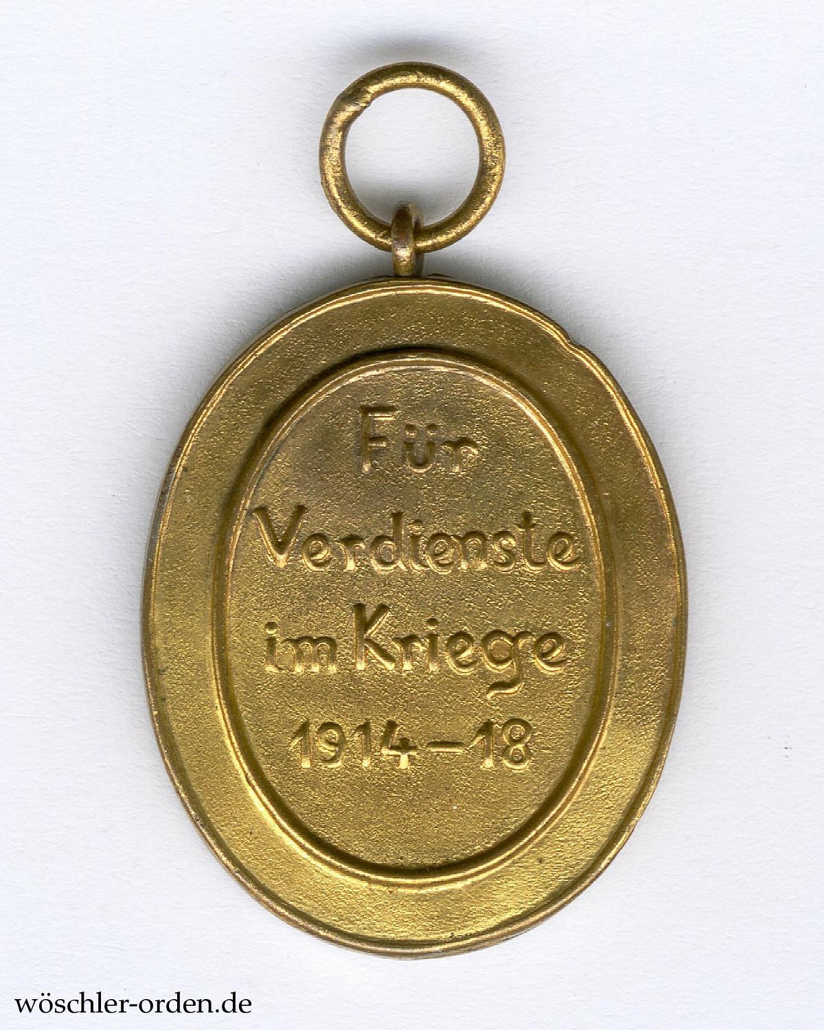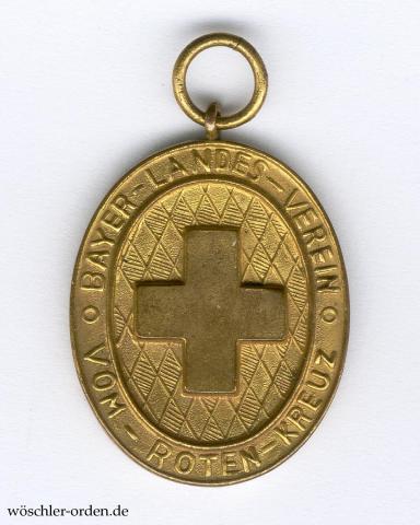 Hochovale Medaille, Buntmetall hohl gefertigt und vergoldet, an angelöteter Ringöse mit offenem Bandring. Vorderseitig das Rote Kreuz auf gerautetem Landeswappen, darum Umschrift „BAYER – LANDES – VEREIN – VOM – ROTEN – KREUZ“, rückseitig vierzeilige Widmungsinschrift „Für / Verdienste / im Kriege / 1914 – 18“.