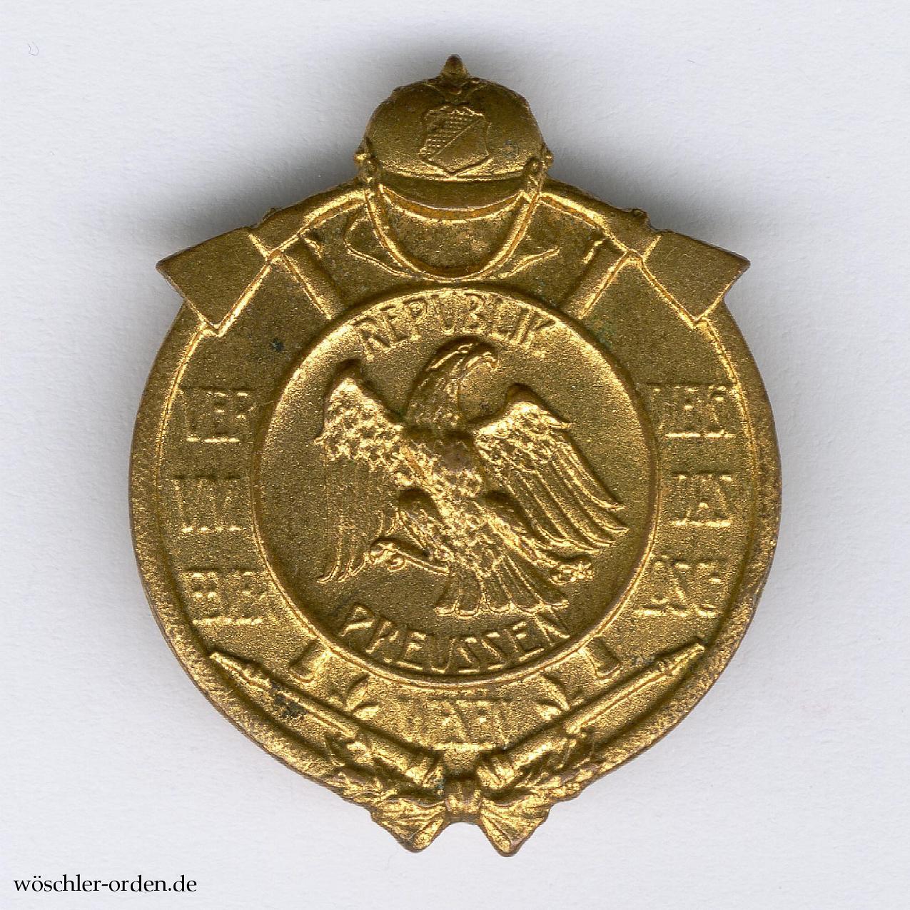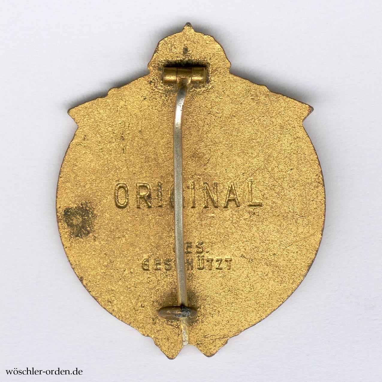 Exemplar des zweiten, 1926 bis 1934 verliehenen republikanischen Modells. Bronze massiv geprägt und vergoldet, rückseitig mit vertieft mitgeprägter Schutzangabe „ORIGINAL“ und „GES. / GESCHÜTZT“ sowie ein angelötetes Nadelsystem mit dünner, runder Tragenadel.