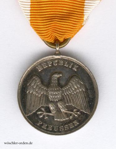 Exemplar der von 1925 bis 1933 geprägten zweiten Ausgabe des zweiten, republikanischen Modells, mit dem Hoheitszeichen des Freistaates Preußen und der Inschrift „REPUBLIK / PREUSSEN“. Silber geprägt, an angelöteter Ringöse mit offenem, unedlem Bandring. Geprägt wurden diese Medaillen in der preußischen Staatsmünze; weder die Zahl der geprägten Medaillen noch die der Verleihungen scheint bislang bekannt zu sein.