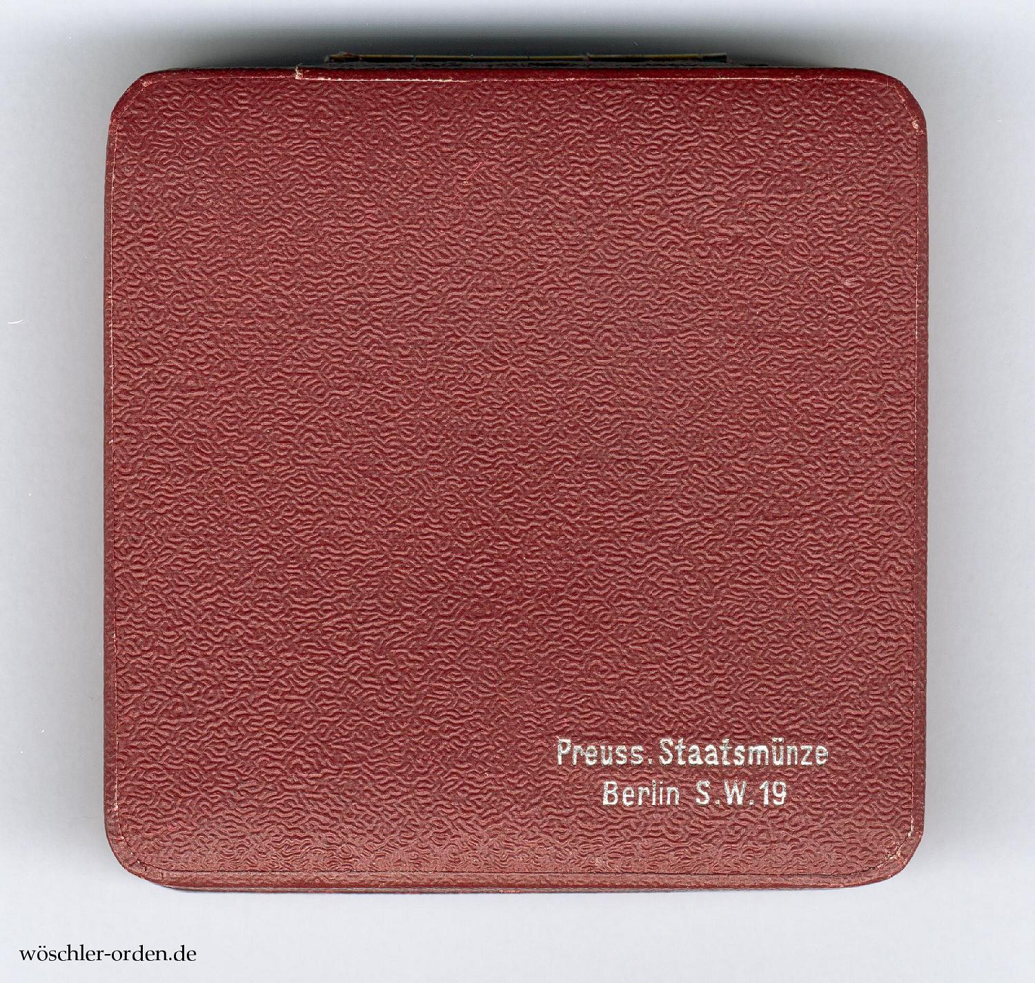 Im rechteckigen, mit weinrotem Kaliko bezogene Verleihungsetui, dessen Deckel mit golden aufgeprägtem preußischem Adler. Innen eine weinrote Samteinlage mit Aussparung für die Medaille, der Deckel in altweißer Seide verkleidet. Auf dem Boden eingeprägte zweizeilige Herstellerangabe „Preuss. Staatsmünze / Berlin S. W. 19“.