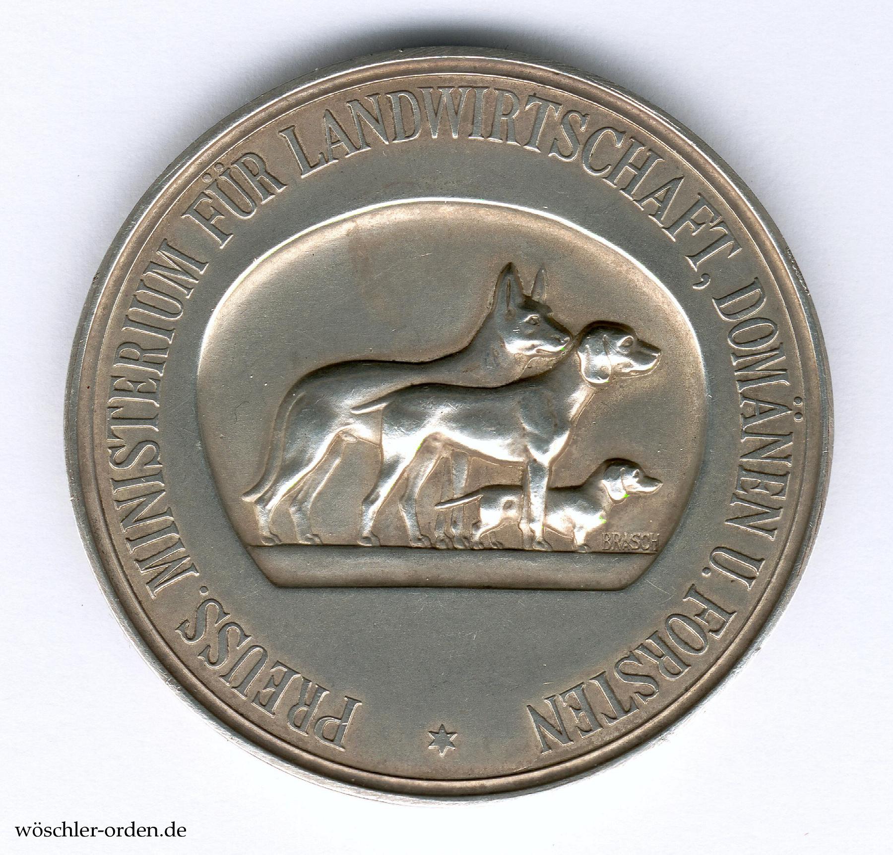 Exemplar der ersten, bis 1932 verliehenen Ausgabe mit Inschrift „PREUSS. MINISTERIUM FÜR LANDWIRTSCHAFT, DOMÄNEN U. FORSTEN“ des zweiten, von 1921 bis 1934 verliehenen freistaatlichen Modells, in der späteren, „echten“ Ausgabe. Silber geprägt und mattiert, mit der Künstlersignatur „BRASCH“ auf der Vorderseite. In Silber wurden hiervon zwischen 1926 und 1932 insgesamt 250 Exemplare geprägt, nachdem bereits seit 1921 eine Interimsprägung aus Eisen stattfand.
