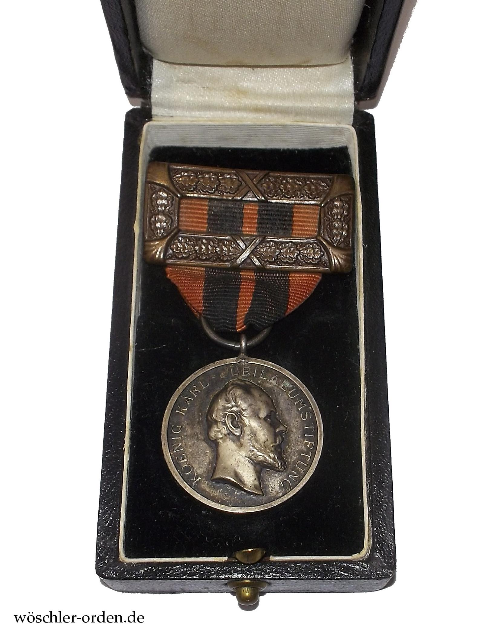 Anlässlich des Silbernen Regierungsjubiläums König Karls wurde im Jahre 1891 die „König-Karl-Jubiläumsstiftung“ ins Leben gerufen, die als Wohlfahrtseinrichtung unter der Aufsicht und unter der Verwaltung des Innenministeriums stand. Ab 1894 wurde eine „Medaille für tüchtige Arbeiter und Bedienstete, welche in einem und demselben Geschäft bzw. Betrieb langjährige, treue und ersprießliche Dienste geleistet haben“ verliehen, und zwar durch den König aufgrund der Vorschläge der Verwaltungskommission besagter Stiftung. Nachdem die Verleihungen mit dem Ende der Monarchie eingestellt worden waren, wurden sie 1921 wieder aufgenommen, mit einer neugestalteten Medaille, die nun das Portrait des Namensgebers der Stiftung trug. Aufgrund unvollständig erhaltener Unterlagen ist die genaue Fertigungszahl des zweiten Modells nicht bekannt, sie dürfte aber bei etwa 11.000 Exemplaren gelegen haben.