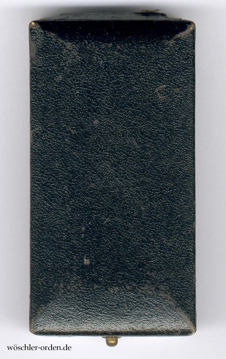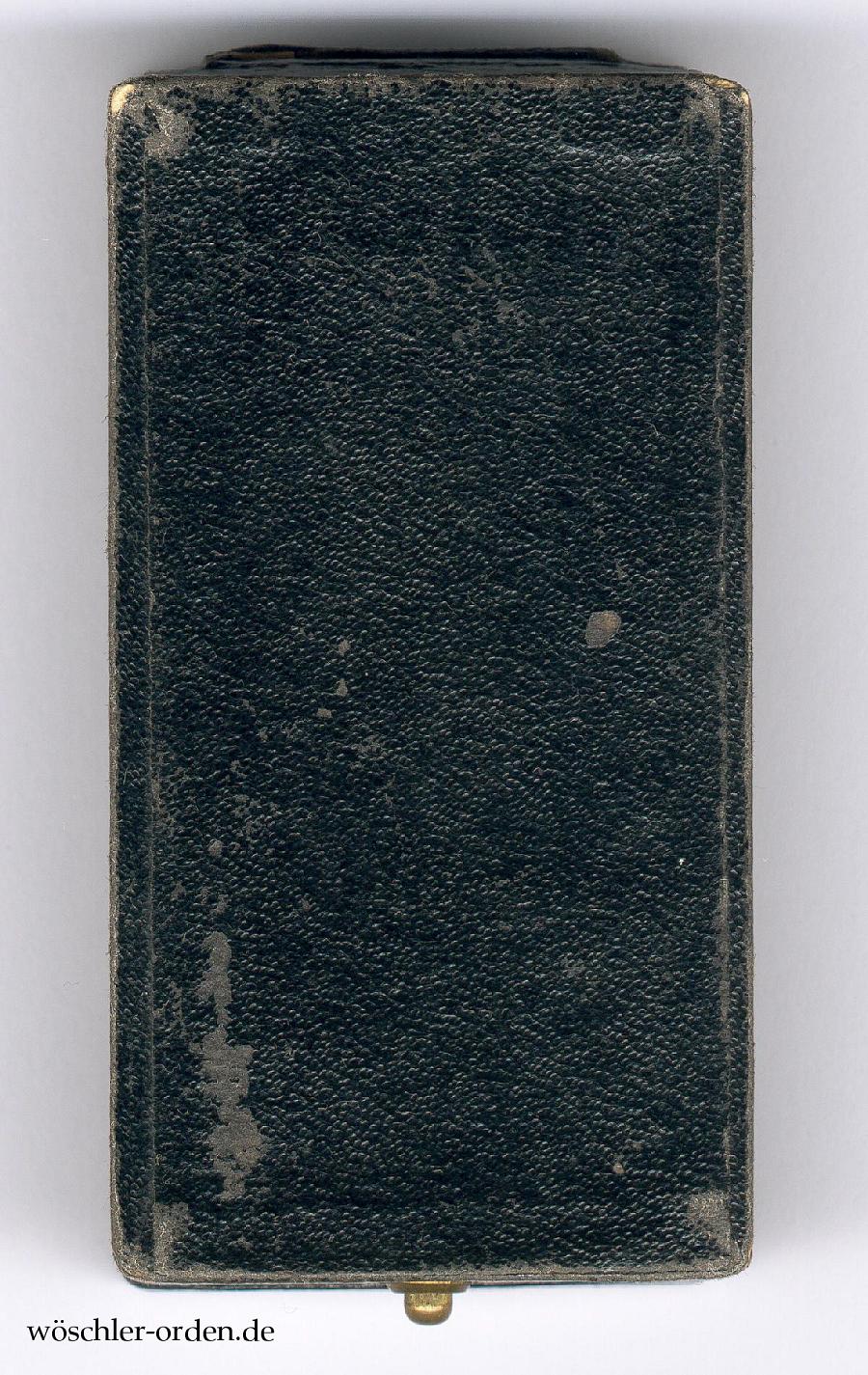 Dazu das Verleihungsetui, schmucklos und mit schwarzem Lederimitat bezogen, innen mit einer Einlage aus schwarzem Samt mit Aussparungen für die Medaille und das Band; der Himmel mit altweißer (Kunst-?) Seide verkleidet.