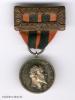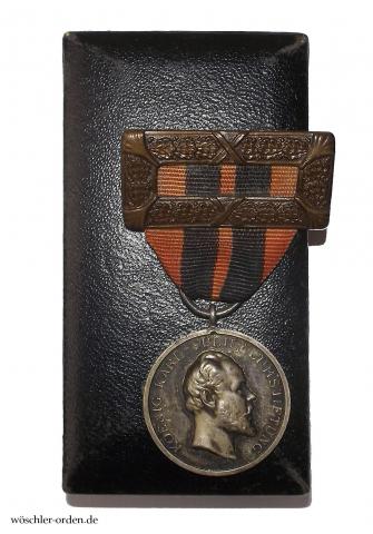 Exemplar des zweiten, von 1921 bis 1937 verliehenen Modells mit dem Portrait des Königs Karl. Tombak geprägt und versilbert, an konfektioniertem Band mit Tragespange, diese aus geprägtem Bronzeblech und rückseitig mit einer dünnen Tragenadel versehen.