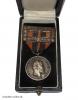 Die Medaille in guter, leicht getragener Erhaltung, jedoch ungleichmäßig patiniert, zudem das Band minimal angeschmutzt. Das Etui ebenfalls mit leichten Alters- bzw. Gebrauchsspuren.
