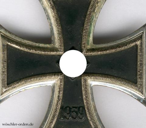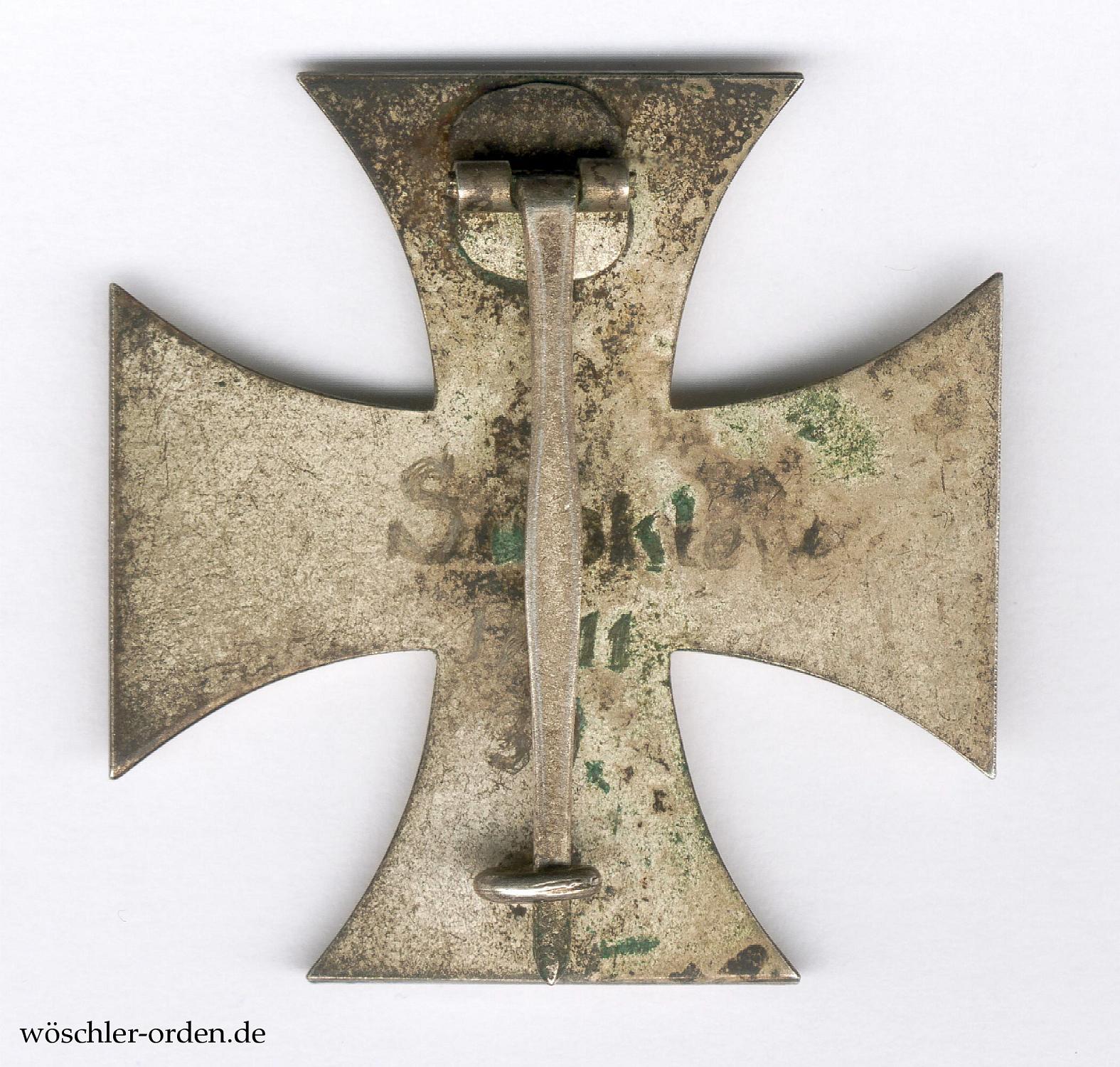 Sehr früh verliehenes Exemplar in der sog. Schinkelform mit mattschwarz lackiertem Nicht-Eisenkern in einer aus Buntmetall geprägten und matt versilberten Zarge. Naturgemäß ohne eine Herstellerpunzierung, jedoch zweifelsfrei der Fertigung der Firma Wilhelm Deumer, Lüdenscheid, zuzuordnen. Rückseitig ordentlich eingeritzt der Name des mutmaßlichen Trägers sowie ein Datum vom November 1939.