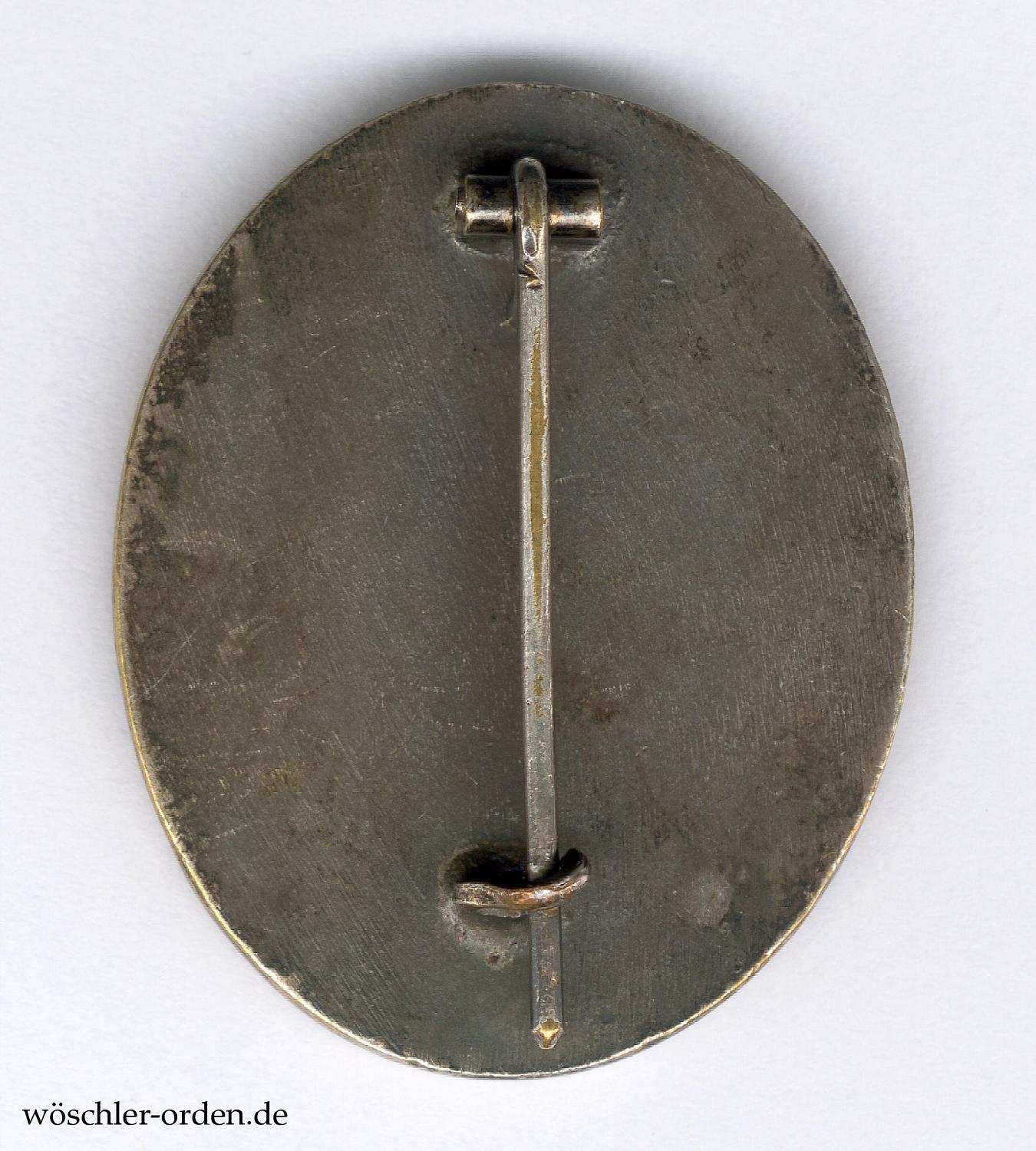 Exemplar der standardisierten, wohl spätestens ab 1941 verausgabten Form in einer recht frühen, noch unmarkierten Fertigung wohl um 1941. Tombak massiv geprägt, versilbert und patiniert, mit rückseitig angelötetem, ebenfalls buntmetallenem Nadelsystem mit dünner Rundnadel. Möglicherweise Fertigung der Firma Gustav Brehmer, Markneukirchen.