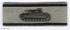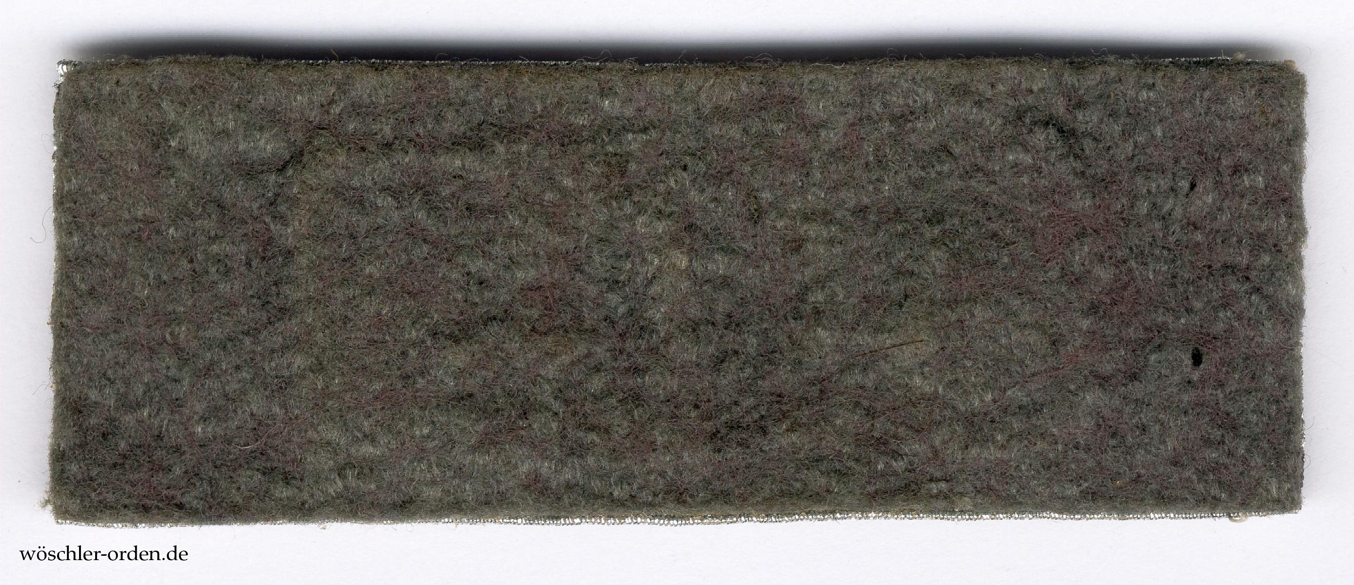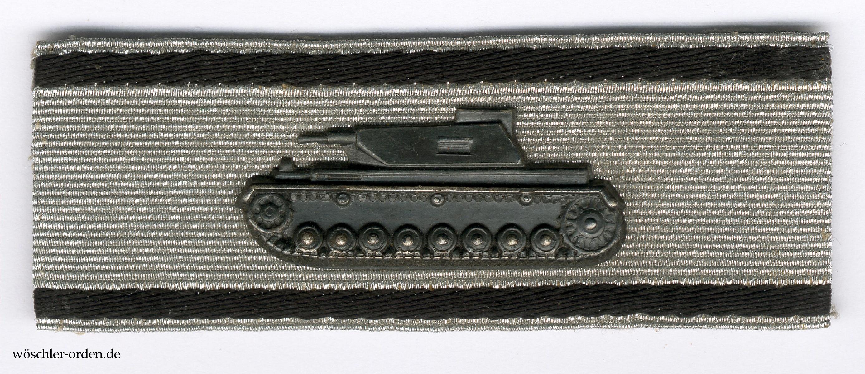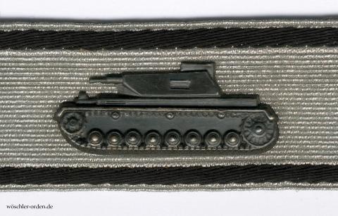 Sehr frühes, hochwertig verarbeitetes Exemplar aus Fertigung mutmaßlich der Moriz Hausch A.-G., Pforzheim, der aufgelegte Panzerkampfwagen aus Neusilber geprägt und geschwärzt, rückseitig mit drei angelöteten Splinten wohl aus Messing und über diese mit einer zinkenen Rückplatte verbunden, auf einem Band aus Aluminiumgespinst mit eingewirkten schwarzen Streifen. Rückseitig ist eine Abdeckung aus hellgrauem Filzdeckstoff aufgeklebt.