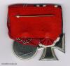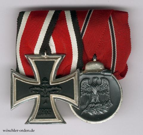 Jeweils Fertigungen in der gemäß Ordengesetz von 1957 zum Tragen in der Bundesrepublik wieder zugelassenen Ausführung ohne Hakenkreuz, sog. „57er-Ausführung“; das Eiserne Kreuz mit schwarz lackiertem Eisenkern in versilberter Buntmetallzarge, die Ostmedaille Buntmetall massiv geprägt, versilbert und patiniert. Die Ordensschnalle mit bogenförmig konfektionierten Bändern, rückseitig mit einer roten Stoffabdeckung sowie einer stabilen Tragenadel. Authentische Fertigung entweder der späten 1950er- oder der 1960er-Jahre.
