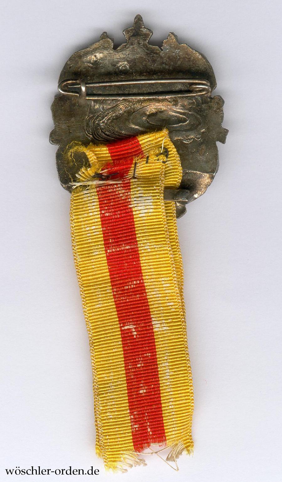 Wohl Kupfer, galvanoplastisch abgeformt, rückseitig massiv ausgegossen und versilbert, die Inschrift in schwarzer Farbe ausgelegt. Rückseitig angelötete Tragenadel und Bügel, durch diesen ein einfaches, landesfarbenes Band.