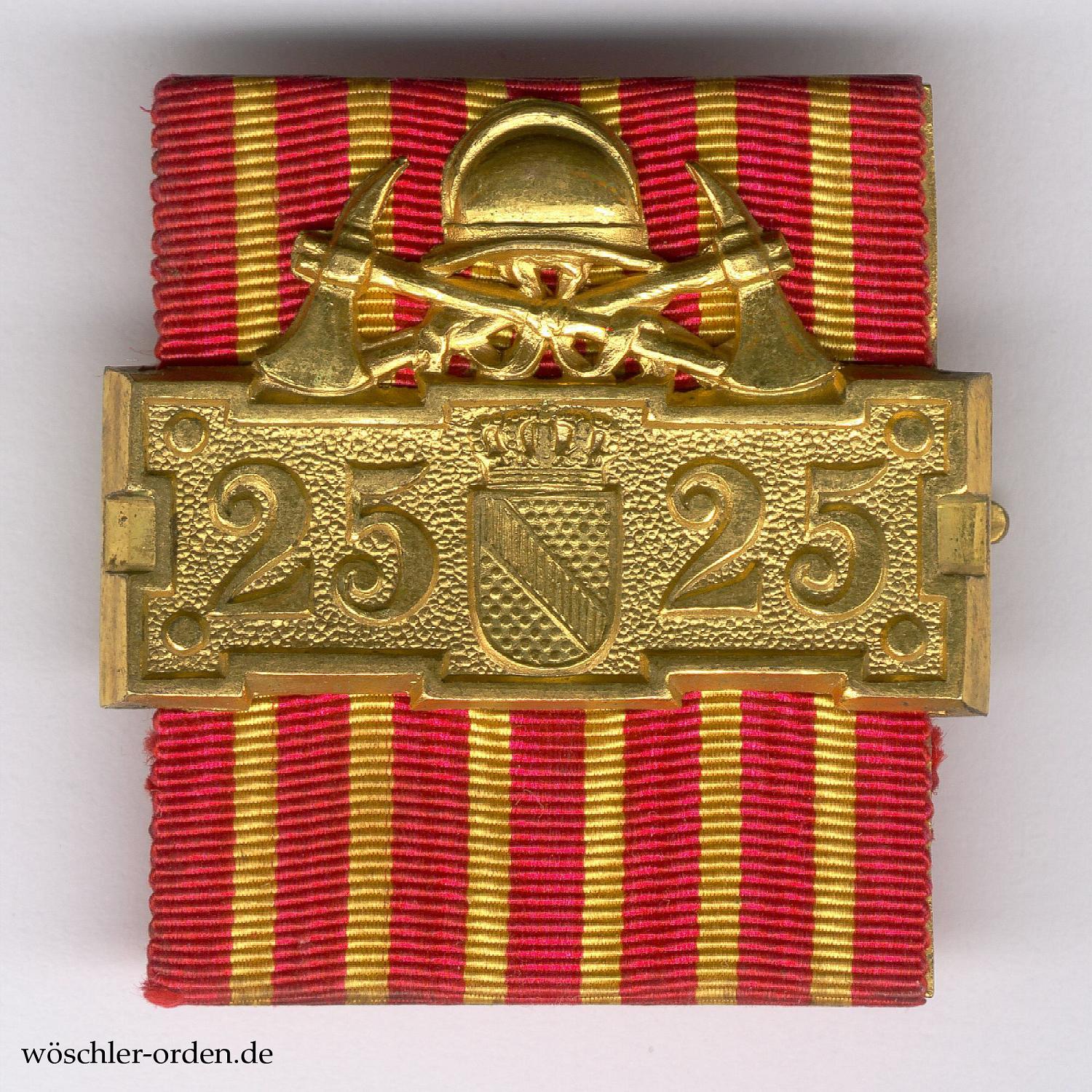 Exemplar des ersten, großherzoglichen Modells. Bronze geprägte und vergoldete Schnalle mit dem gekrönten badischen Wappenschild zwischen der doppelten Zahl „25“, darüber ein Feuerwehrhelm mit gekreuzten Beilen. Auf mit Band überzogener Platte, diese etwa 42 mm hoch und 35 mm breit. Rückseitig stabile Tragenadel. Wohl eher spätes Exemplar mit grob gekörntem Untergrund, bei Volle als Variante „18.3“ bezeichnet. Als Hersteller dieser Auszeichnung ist über entsprechende Inschriften in Verleihungsetuis der Hofjuwelier Ludwig Bertsch, Karlsruhe, nachgewiesen. Die ältesten Stücke lieferte möglicherweise dessen Vorgänger Ludwig Paar, ebenfalls Karlsruhe.