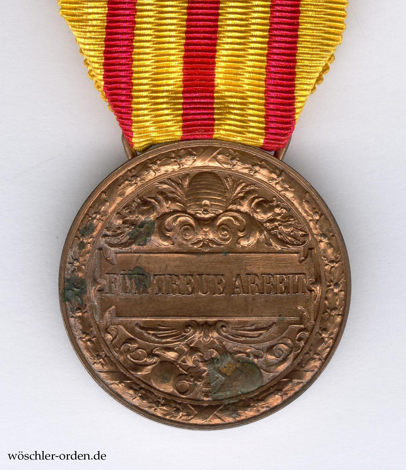 Das Ehrenzeichen „Für treue Arbeit“ wurde durch eine landesherrliche Verordnung Friedrich I. am 11. November 1895 für solche Arbeiter und männliche Dienstboten, „welche durch eine lange Reihe von Jahren in demselben Arbeits- oder Dienstverhältnis gestanden haben, unbescholten sind und pflichttreue Gesinnung gegen Uns und das Vaterland bewährt haben“, gestiftet. In der Praxis mussten mindestens 30 Arbeits- bzw. Dienstjahre, vom 25. Lebensjahr an gerechnet, erbracht werden. Mit dem Ende der Monarchie wurden die Verleihungen eingestellt. Geprägt wurden in Bronze, für beide Ausgaben zusammen, insgesamt 6050 Exemplare, in verkupfertem Eisen weitere 2100 Exemplare. Die Medaillen der zweiten Ausgabe dürften somit die geringste Auflage haben.