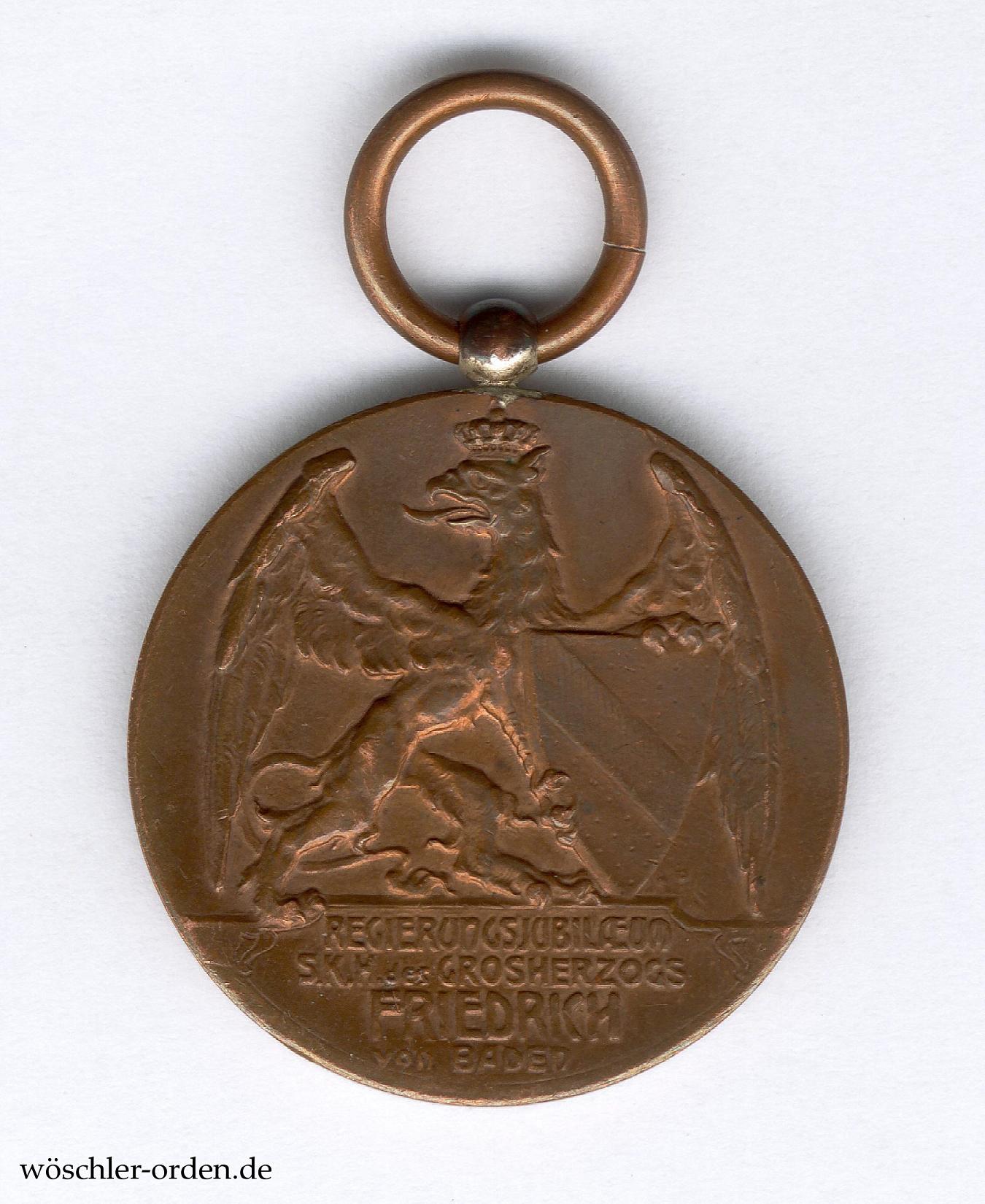 Diese Jubiläumsmedaille wurde durch Großherzog Friedrich I. aus Anlass seines 50-jährigen Regierungsjubiläums am 25. April 1902 für alle Personen, die während seiner Regierung ihm und dem badischen Lande „in öffentlicher Tätigkeit Dienste geleistet haben“, gestiftet. Sie wurde relativ „flächendeckend“ an Militär, Hof- und Staatsbeamtenschaft, Politik, Klerus sowie weitere in der Öffentlichkeit stehende Personengruppen vergeben. Insgesamt wurden 30.000 Exemplare geprägt, die wohl auch großteils zur Ausgabe kamen. Fürstlichkeiten, die an den Jubiläumsfeierlichkeiten teilnahmen, erhielten eine nicht-statutengemäße Ausgabe in Gold, die als ein persönliches Geschenk des Großherzogs zu verstehen ist.