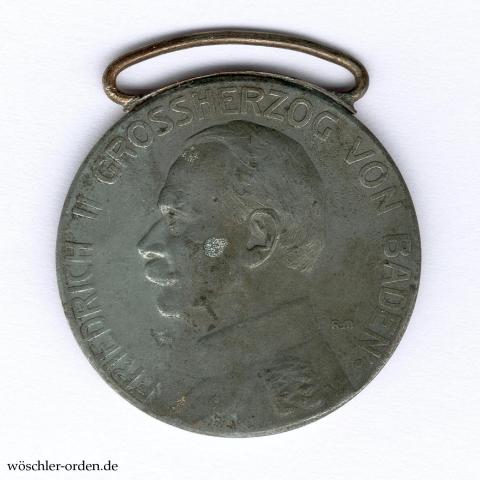 Exemplar des von 1908 bis 1918 verliehenen neunten (bei Volle: dreizehnten) Modells mit dem Portrait Großherzog Friedrich II., in der zweiten, ab etwa Juli 1916 in B. H. Mayers Hofkunstprägeanstalt, Pforzheim, geprägten Ausgabe. Kriegsmetall geprägt und versilbert, an angelötetem Tragebügel, mit der für die „unechten“ Exemplare obligatorischen Randpunze. Das Portrait der Vorderseite schuf der Medailleur und Ziseleur Prof. Rudolf Mayer. Unter Friedrich II. sind etwa 132.350 Verleihungen der Silbernen Verdienstmedaillen nachweisbar, davon etwa 129.300 am Bande der Militärischen Karl-Friedrich-Verdienstmedaille.