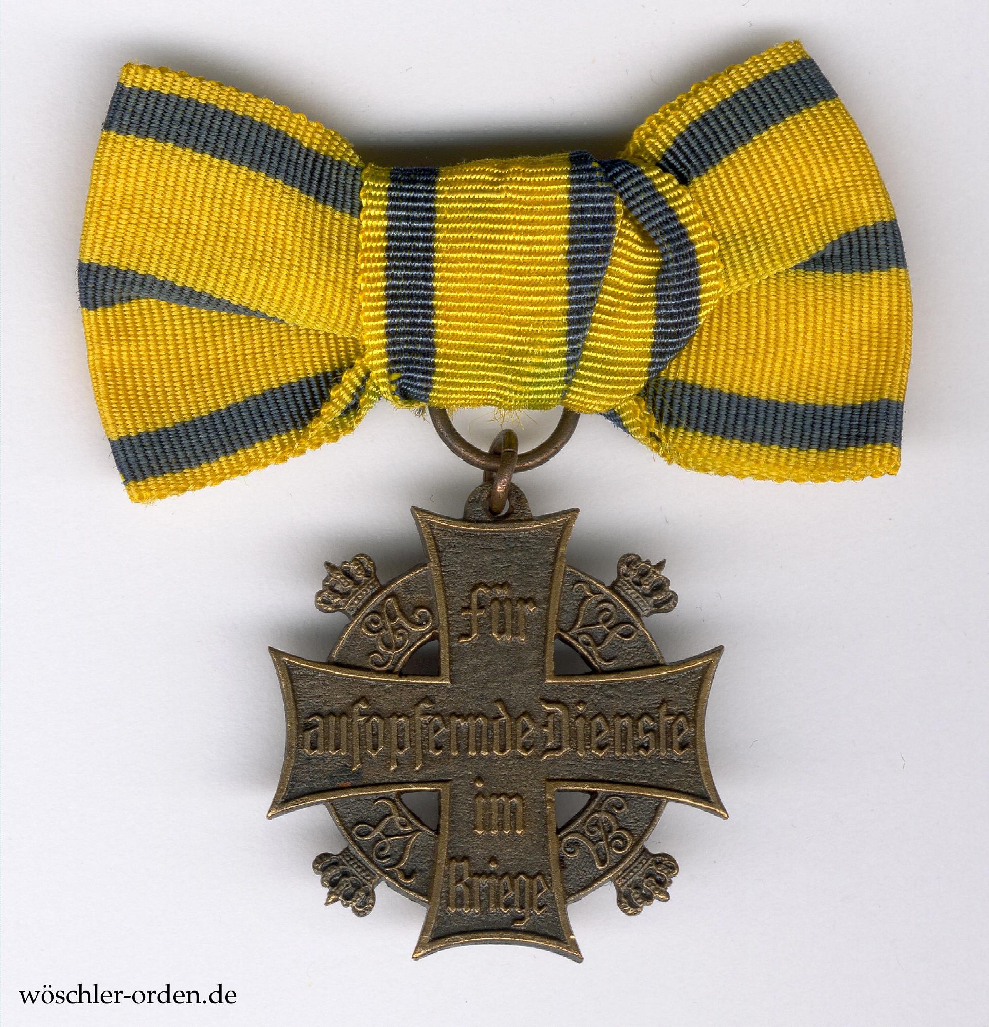Das Kriegsverdienstkreuz für Frauen und Jungfrauen wurde durch Herzog Ernst August am 13. September 1917, dem 25. Geburtstag seiner Gattin, der Herzogin Victoria Luise, gestiftet, um „ohne Unterschied des Ranges oder Standes in nur einer Klasse an Frauen und Jungfrauen für Verdienste um den Krieg verliehen“ zu werden. Die Zahl der Verleihungen ist nicht dokumentiert, lässt sich jedoch anhand erhaltener Lieferakten auf etwa 1320 schätzen.