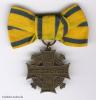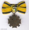 Bronze geprägt und patiniert, an parallel mitgeprägter, gelochter Ringöse mit einem offenem Verbindungsringchen sowie einem geschlossenem Bandring. Mit der eigentlichen Rückseite nach vorne an einem zu einer Schleife konfektioniertem Band montiert, dieses mit einer rückseitig angenähten Tragenadel.