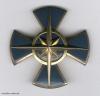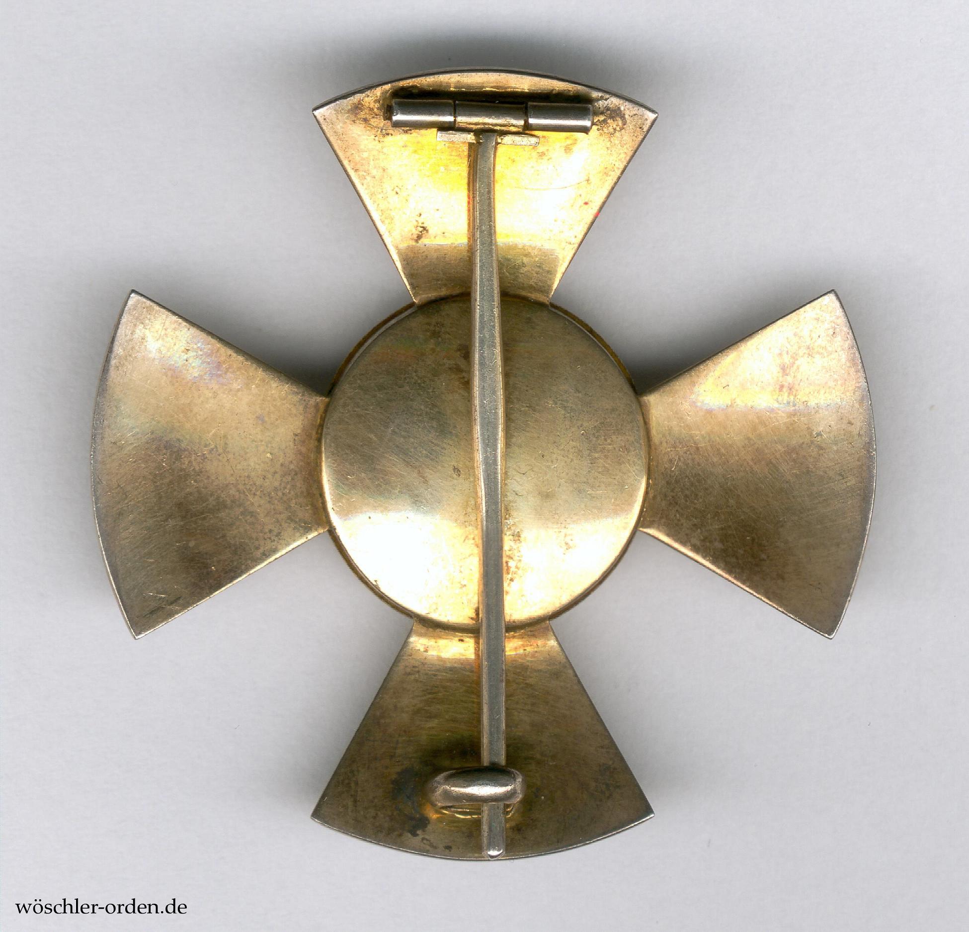 Silber mehrteilig gefertigt und vergoldet, die vorderseitigen Kreuzarmflächen und der Medaillonhintergrund opak schwarzgrau emailliert. Rückseitig eine abgeflachte, ebenfalls vergoldete Tragenadel. Ohne jegliche Punzierungen, jedoch augenscheinlich aus Fertigung der Firma C. F. Zimmermann, Pforzheim, stammend.