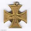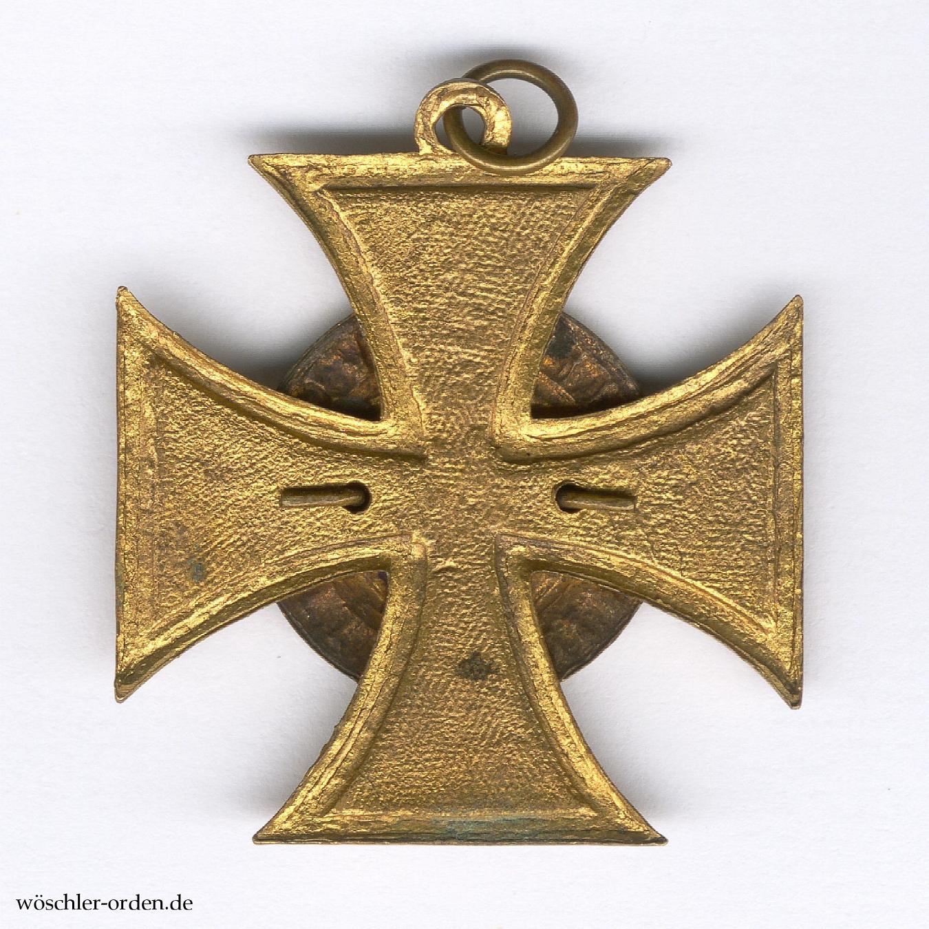 Das Kreuz aus Buntmetall einteilig halbhohl geprägt und vergoldet, darauf aufgesplintet ein einteilig gefertigtes, emailliertes Medaillon mit dem Hohenzollernwappen. An mitgeprägter Parallelöse, durch diese ein rundlicher Bandring. Ohne eine Herstellerkennzeichnung.