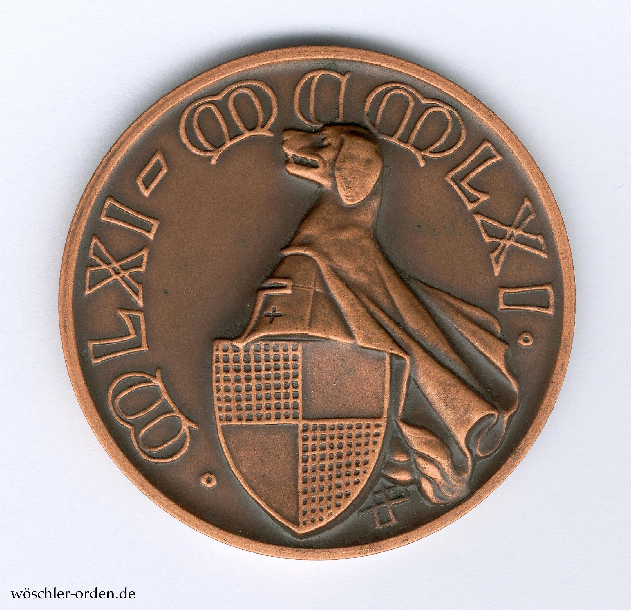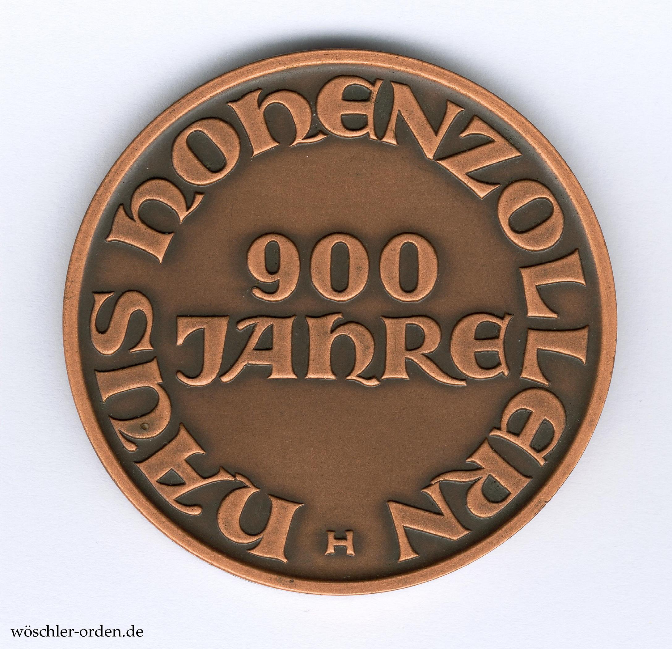 Bronze geprägt und patiniert, etwa 58 mm. Vorderseitig das Hohenzollern’sche Wappen mit römischen Jahreszahlen „MLXI“ und „MCMLXI“, rückseitig Inschrift „900 JAHRE / HAUS HOHENZOLLERN“ und Signatur(?) „H“.