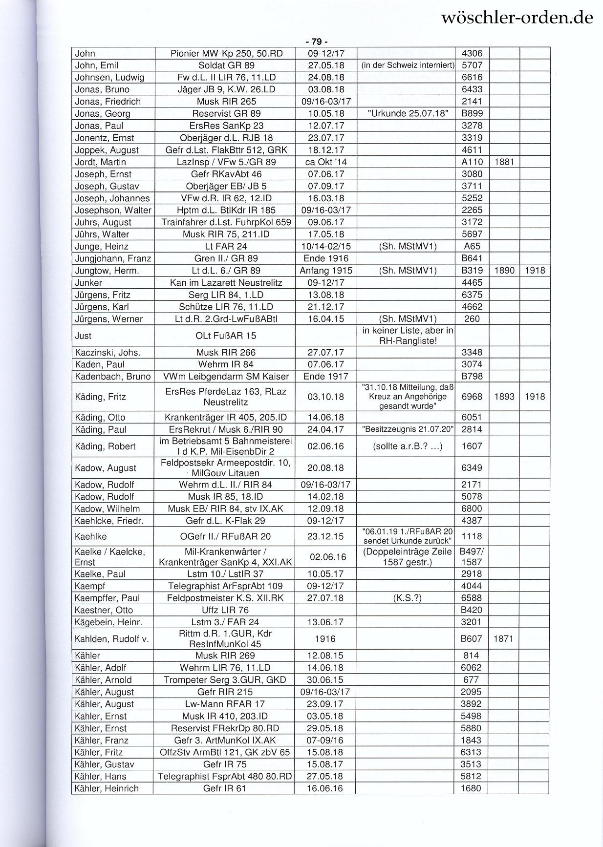 Alphabetisch gelistet sind sämtliche nachweisbaren Verleihungen des Kreuzes für Auszeichnung im Kriege 1. Klasse, 2. Klasse „Für Tapferkeit“, 2. Klasse für Frauen, 2. Klasse am roten Band sowie die regulären 2.-Klasse-Verleihungen (an Nichtpreußen separat!), des Adolf-Friedrich-Kreuzes und der Kriegervereinsmedaille.