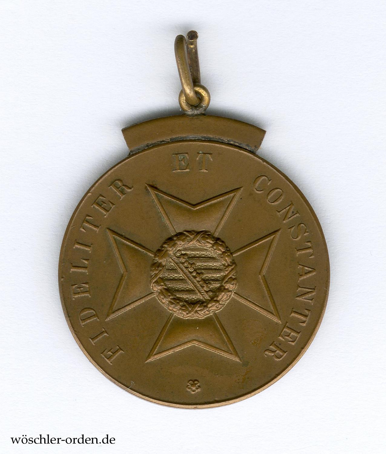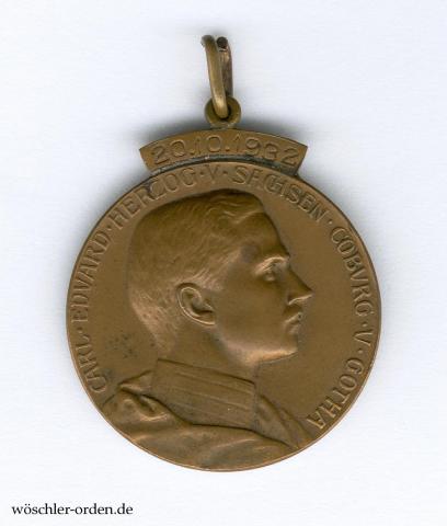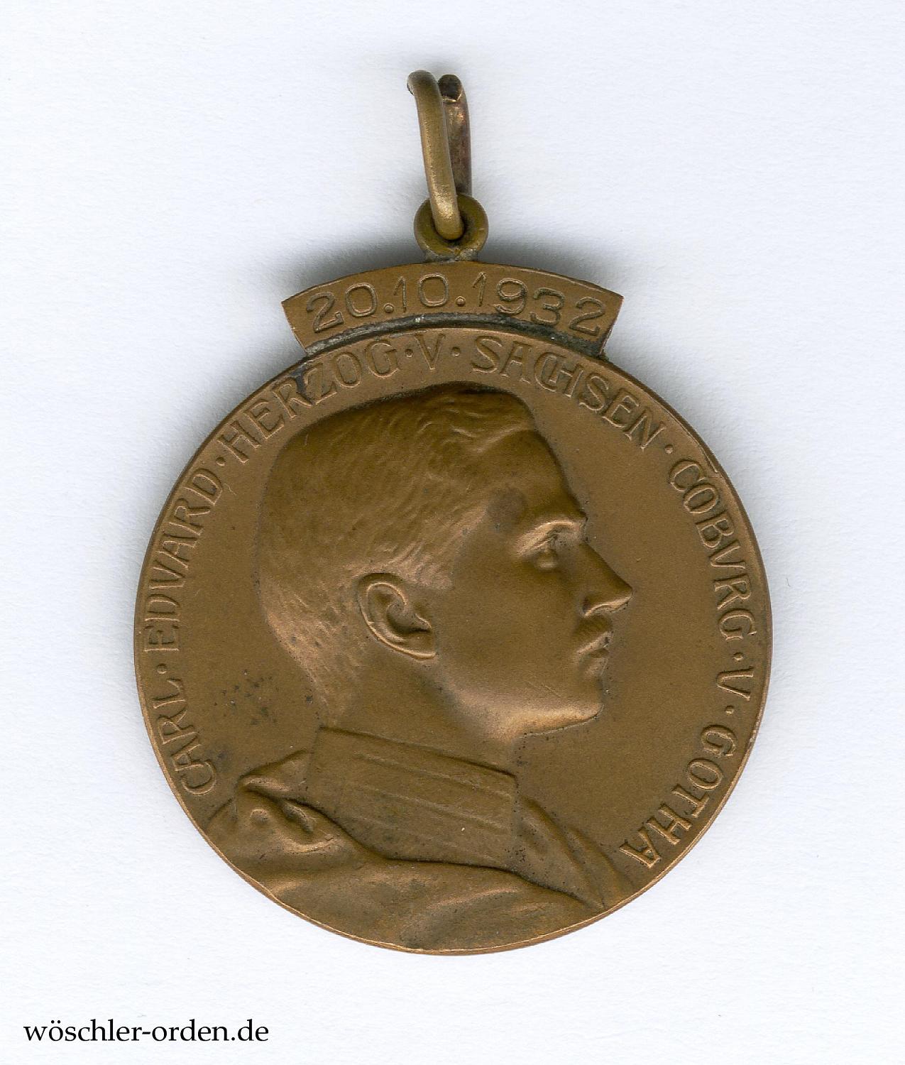 Bronze geprägt, an angelöteter, paralleler Ringöse mit kleinem Bandringchen. In Größe und Prägung entspricht diese Medaille vollkommen den Medaillen des Sachsen-Ernestinischen Hausordens, die es jedoch in Bronze nicht gab, von dem überhöhenden Datumsband „20.10.1932“ abgesehen.