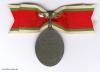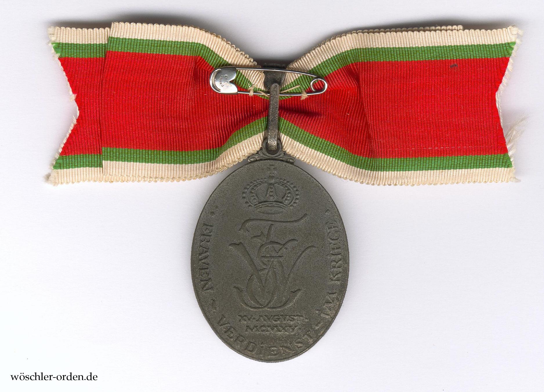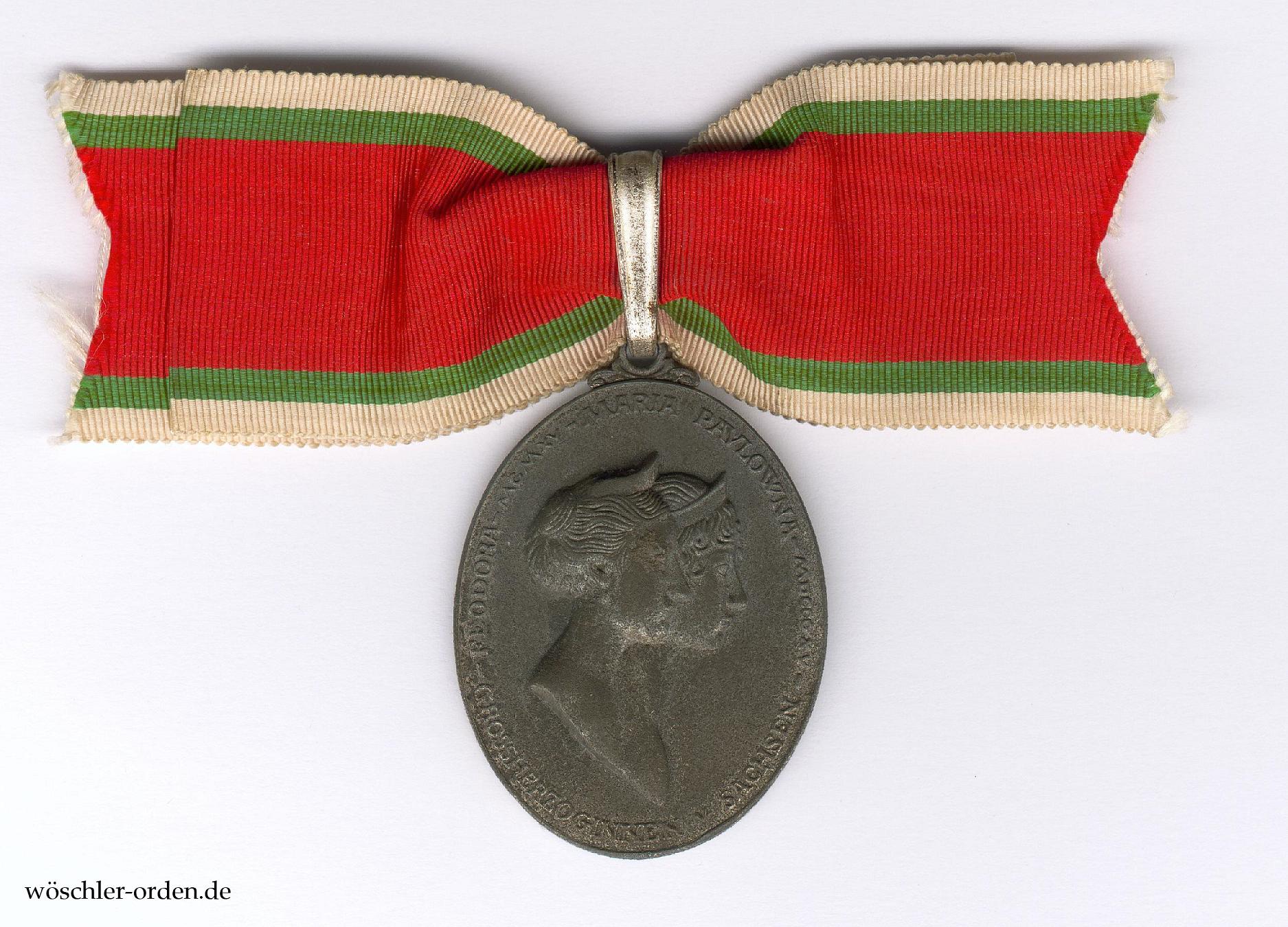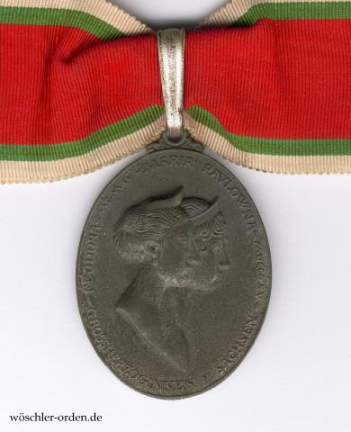 Hochovale Medaille, Zink geprägt und matt versilbert, an mitgeprägter, gelochter Zieröse mit länglichem Bandring aus versilbertem Eisen oder Stahl. An wohl offiziell konfektionierter Damenschleife mit rückseitig angenähter Tragenadel.