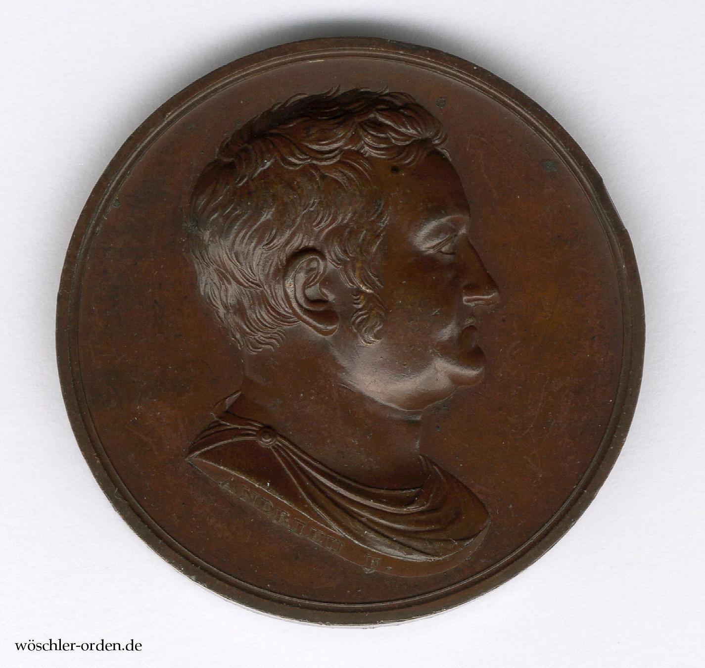 Ursprüngliche, nichttragbare Ausgabe mit der dreizeiligen Rückseiteninschrift „MITESCVNT / ASPERA / SAECLA“. Bronze geprägt und patiniert, vorderseitig das nach rechts gewandte Portrait des Stifters in antiker Gewandung, am Halsabschnitt die Signatur „ANDRIEU F.“ des namhaften Pariser Stahlstechers, Graveurs und Medailleurs Bertrand Andrieu, der auch das wohl berühmteste Medaillenportrait Napoléons schuf. Rückseitig besagte Inschrift in mit einer Bandschleife gebundenem „Erntekranz“ aus Ähren, Rosen und Feldblumen.