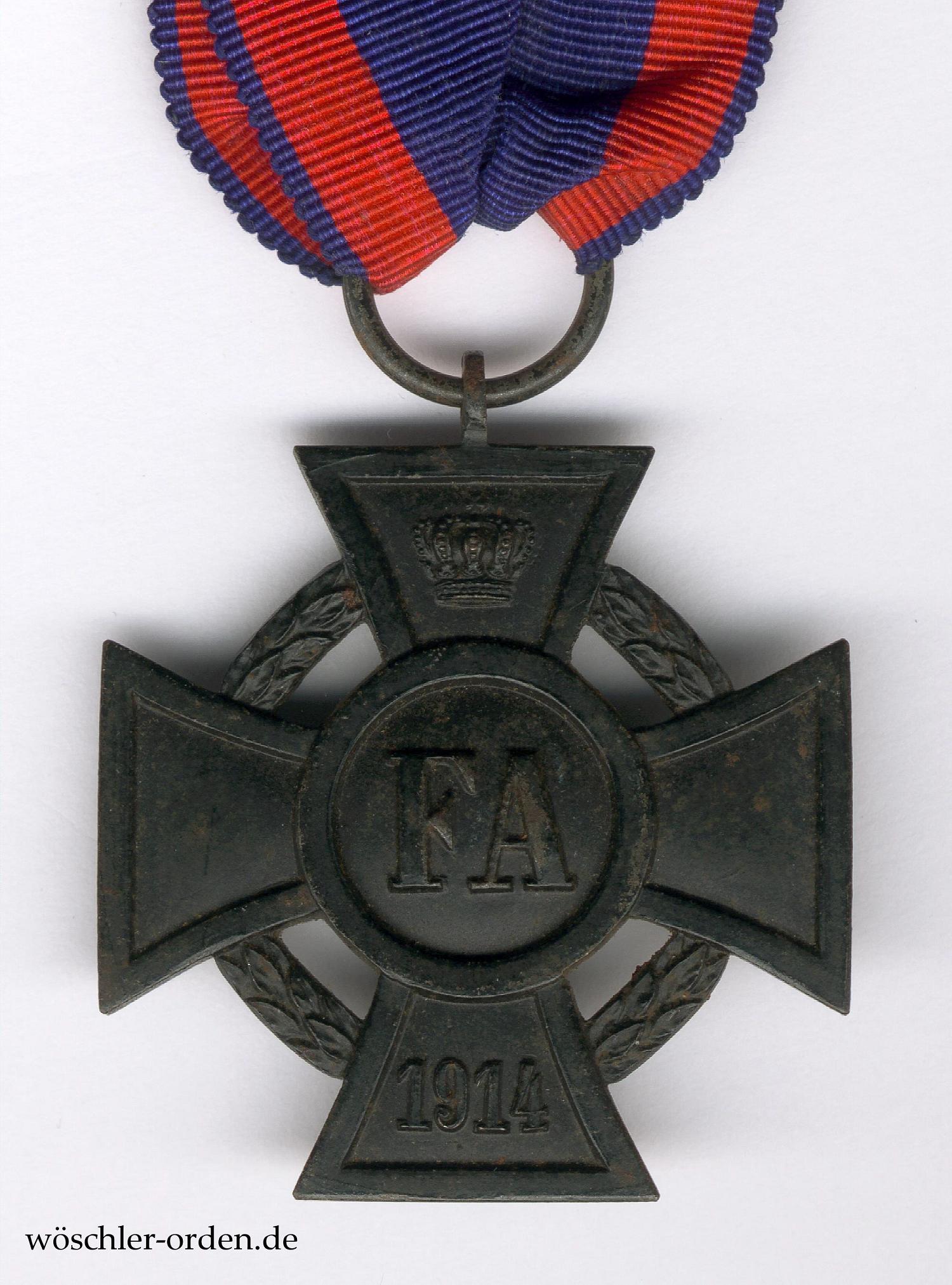 Das Friedrich-August-Kreuz wurde am 24. September 1914 von Großherzog Friedrich August für Offiziere, Unteroffiziere und Mannschaften sowie sonstige Personen des Großherzogtums und solche, die zu dem Stifter und seinem Lande in näherer Beziehung standen, als Kriegsauszeichnung in zwei Klassen gestiftet, wobei die II. Klasse auch an Daheimgebliebene – dann an einem Band in „verkehrten“ Farben – verliehen werden konnte. Der Entwurf des Kreuzes stammte vom Flügeladjutanten des Großherzog, Oberst von Jordan. Für die II. Klasse am Band für Kämpfer lassen sich knapp 55.000 Verleihungen nachweisen.