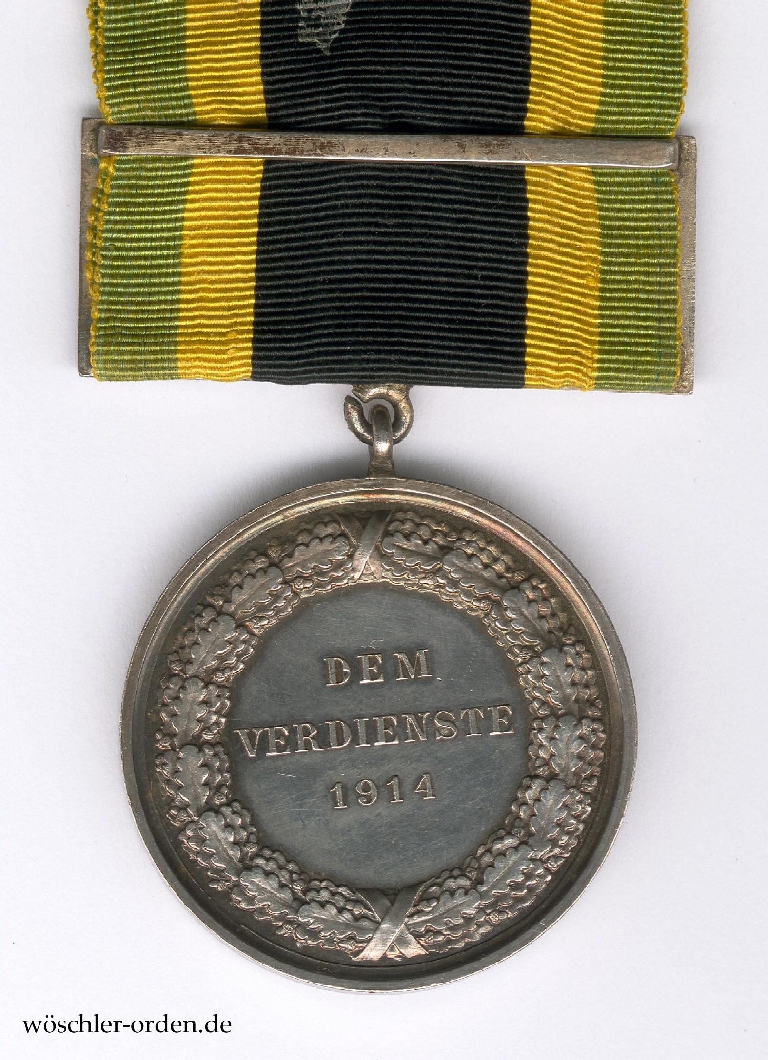 Nach Beginn des Weltkrieges verfügte Großherzog Ernst Wilhelm, dass der rückseitigen Inschrift des Allgemeinen Ehrenzeichens „DEM VERDIENSTE“ die Jahreszahl „1914“ hinzugefügt werden solle. Klee gibt an, dass 4911 Medaillen in Silber mit Schwertern verliehen wurden, von denen Lundström und Krause lediglich 3887 Träger namentlich auflisten. Die Verleihungen der Medaille als staatliche Auszeichnung endeten zwar 1918, allerdings vergab der vormalige Großherzog aus seinem Exil in Heinrichsau weiterhin, bis zu seinem Tod im Jahre 1923, Medaillen als „Erinnerungsstücke“.