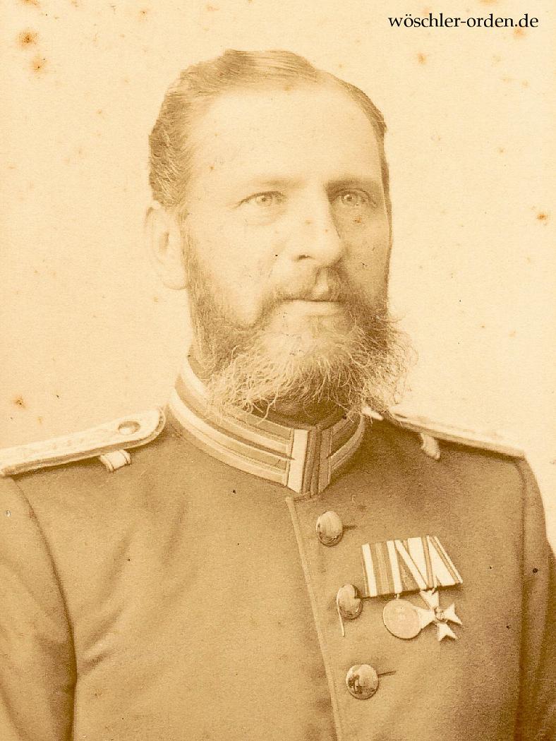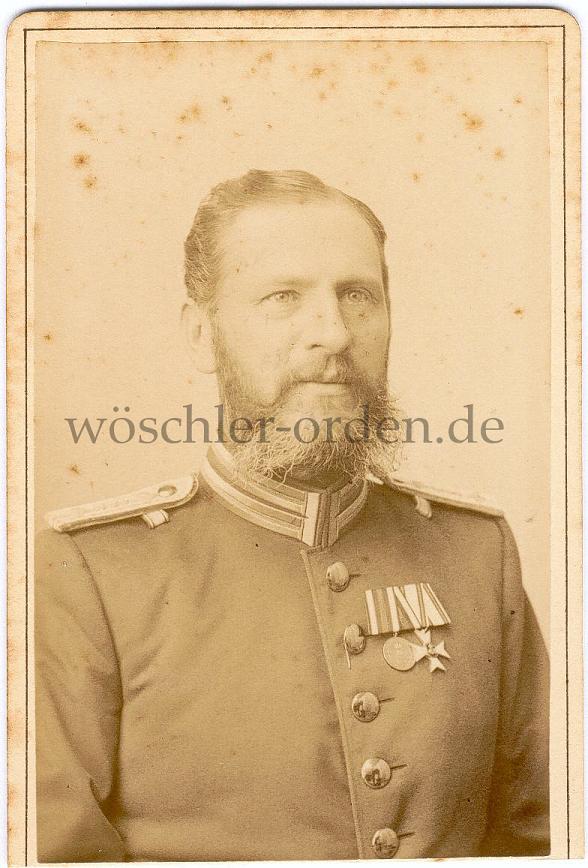 Fürstentum Waldeck und Pyrmont, Portraitphotographie eines Militärs wohl im Infanterie-Regiment „von Wittlich“ (3. Kurhessisches) No. 83, Arolsen, im Subalternoffiziersrang. Er trägt eine 2-teilige Große Ordensschnalle, an der sich folgende Auszeichnungen befinden: