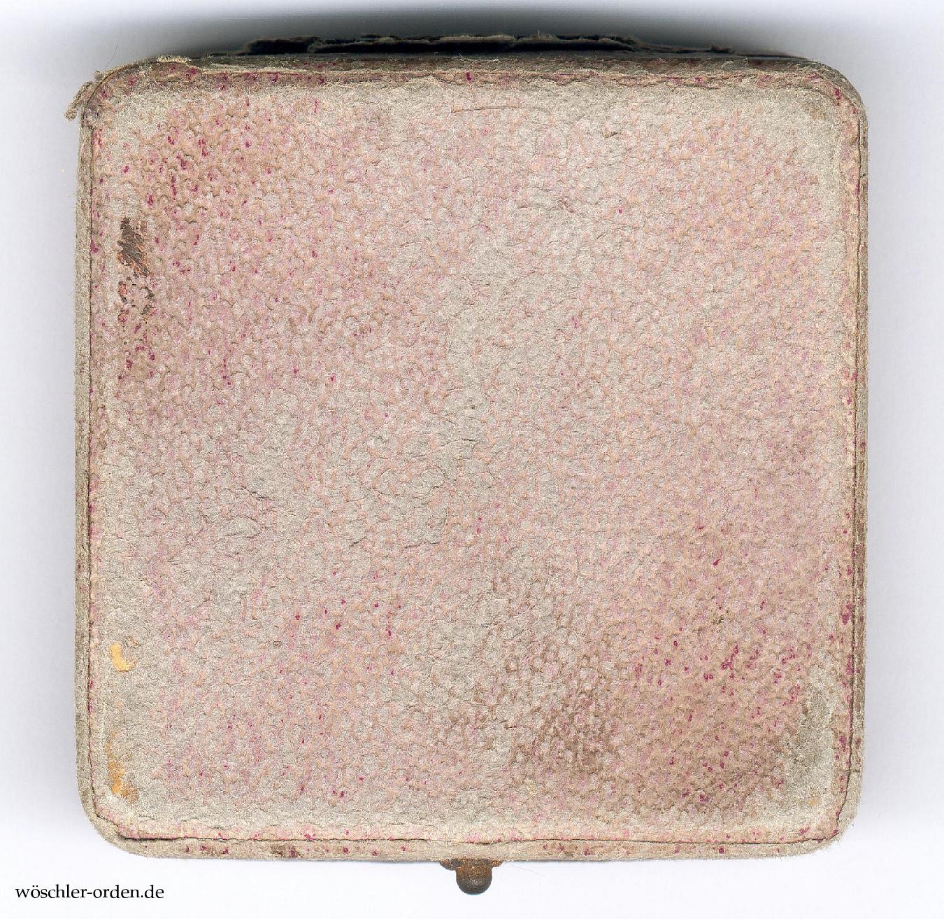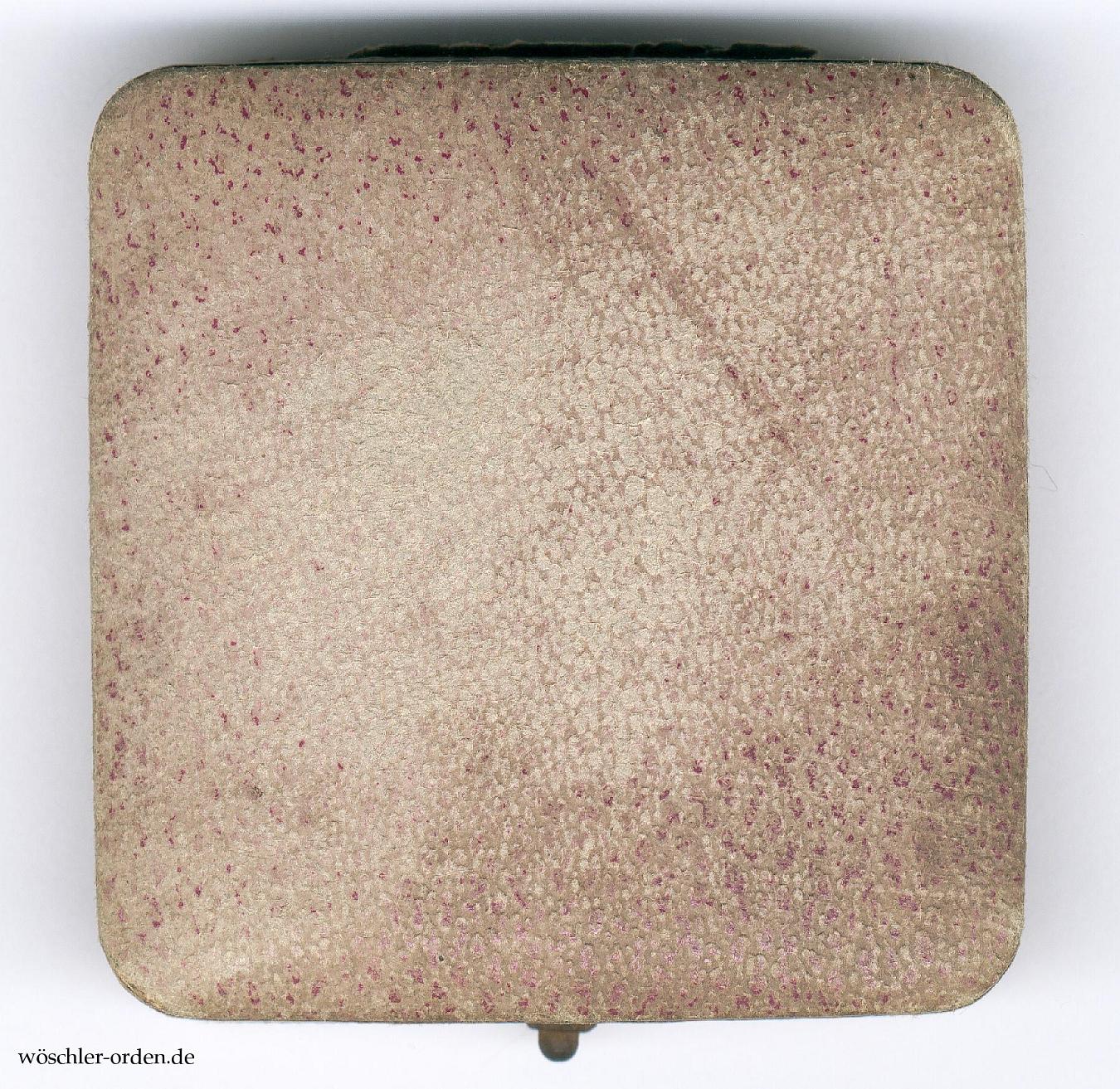 Dazu ein schmuckloses Etui, außen mit weinrotem(?) Lederimitat bezogen, innen mit dunkelblauer Samteinlage mit Aussparung für die Medaille und ebenfalls dunkelblauer Seidenverkleidung des Himmels. Ob es sich hierbei um ein offizielles Verleihungs- bzw. Vergabeetui handelt, kann ich in Ermangelung von Referenzstücken nicht beurteilen.