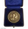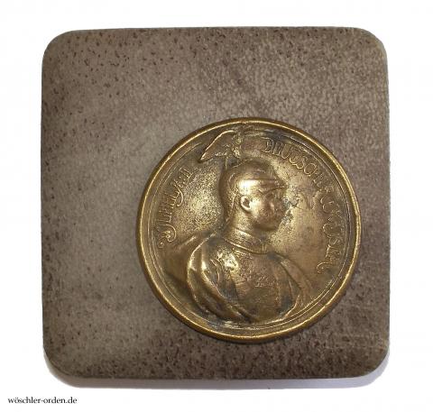 Die Medaille in deutlich gebrauchter bzw. verputzter Erhaltung mit deutlichem Abrieb des Reliefs sowie alten Putzmittelresten in den Vertiefungen. Das Etui äußerlich stark berieben und mutmaßlich mit einem Feuchtigkeitsschaden, innen jedoch noch quasi tadellos erhalten.
